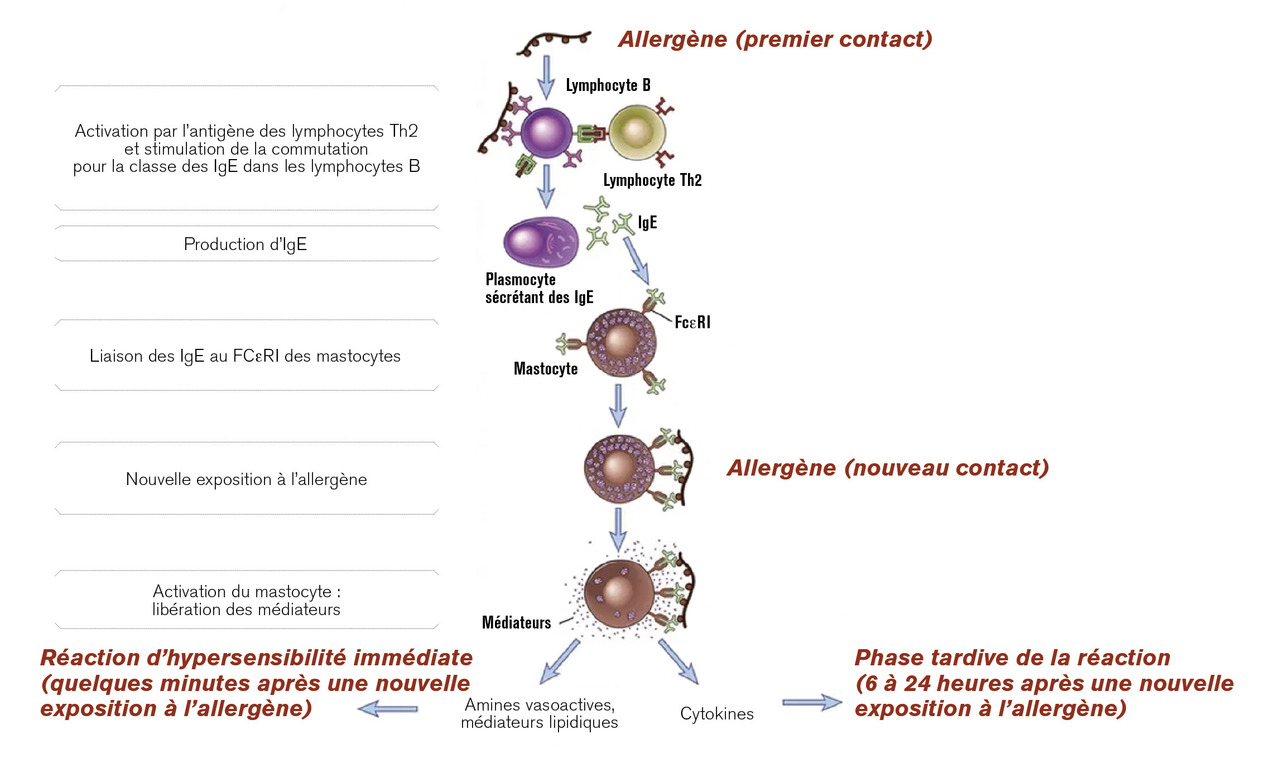 L’allergène est pris en charge par les cellules présentatrices d’antigènes, et présenté aux lymphocytes T CD4+, qui vont alors se différencier en lymphocytes T2, avec production d’interleukines (IL-4, IL-5, IL-13). Ces interleukines provoquent la synthèse d’IgE spécifiques de l’allergène par les lymphocytes B. Ces IgE vont se fixer par leur fragment constant aux mastocytes et polynucléaires basophiles par leur récepteur de haute affinité FcεRI et aux macrophages, aux polynucléaires éosinophiles, aux lymphocytes B et aux plaquettes par leur récepteur de basse affinité FcεRII = CD23 ;