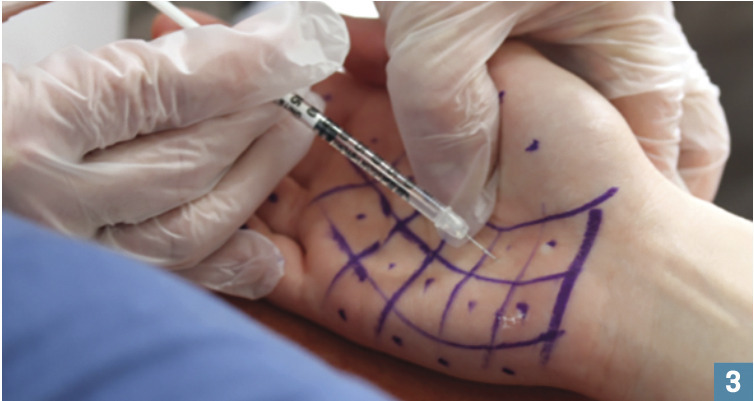 – grâce à de multiples aiguilles introduites à travers la peau, elle détruit par la chaleur les glandes sudoripares des zones hypersécrétantes (déterminées par test à l’iode) sous anesthésie locale ;