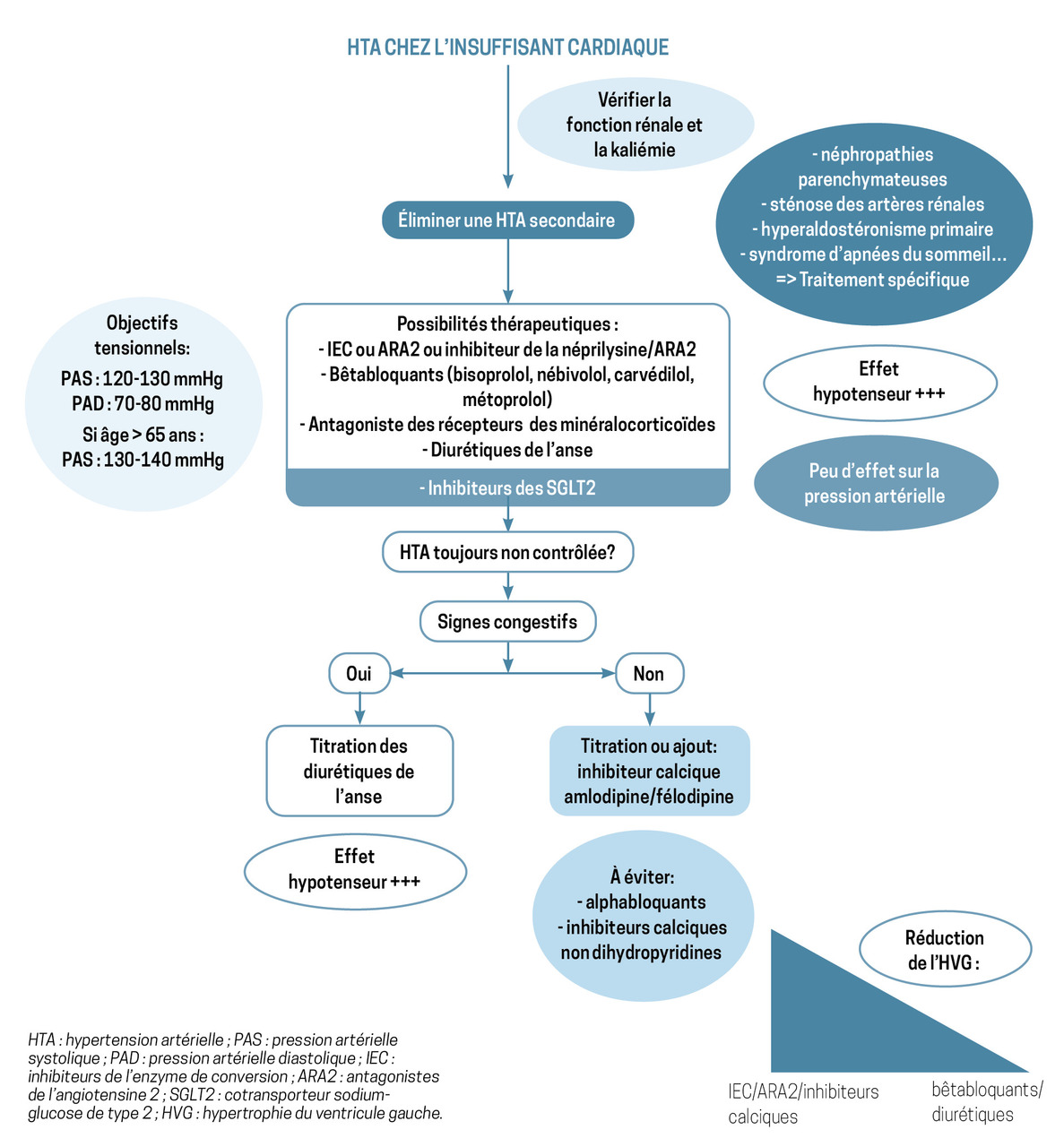 La gestion de l’HTA chez les patients insuffisants cardiaques n’est pas différente, et les grandes lignes de traitement sont superposables à celles de la population générale.