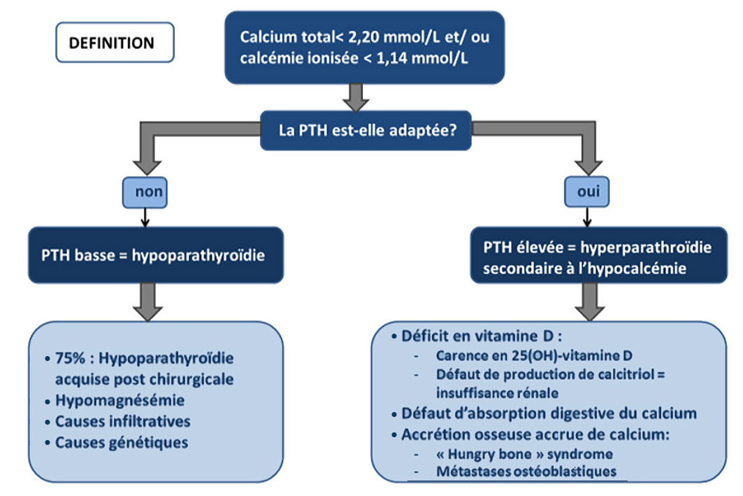 Calcémie totale inférieure à 2,20 mmol/L, à confirmer par une seconde mesure ou, si disponible rapidement (pas de congélation ni export), par la calcémie ionisée (grandeur régulée physiologique).
