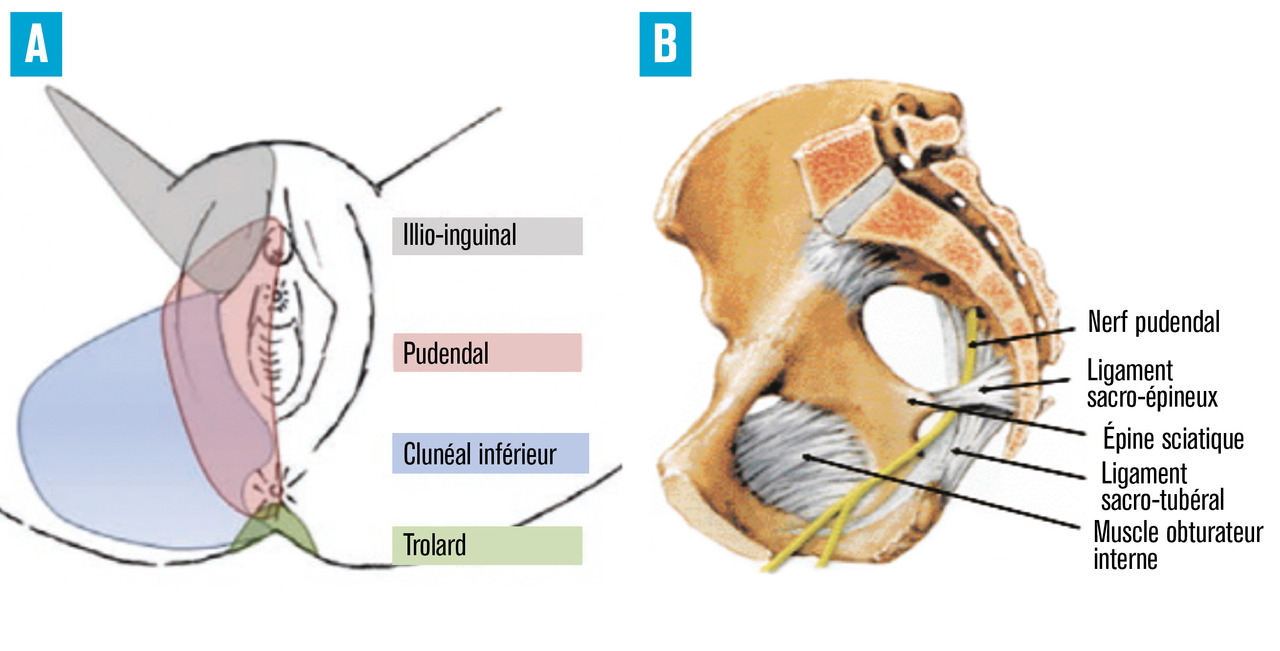 Le nerf pudendal émerge du plexus sacré, principalement de la racine S3, avec des fibres qui dérivent aussi des racines S2 et S4. C’est un nerf mixte, avec une composante motrice et une composante sensitive.4 Il traverse le grand foramen ischiatique accompagné de l’artère et des veines pudendales pour passer au travers de l’espace interligamentaire du ligament sacro-épineux, délimité au-dessus par le ligament sacro-épineux (tendu entre le sacrum et l’épine ischiatique) et en dessous par le ligament sacrotubéral (tendu entre le sacrum et la tubérosité ischiatique) [