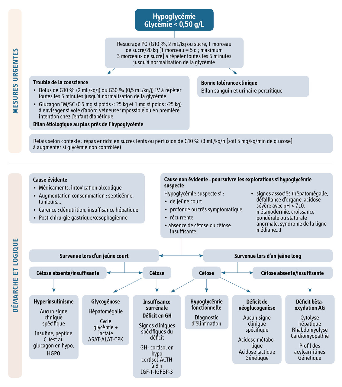 Une glycémie capillaire doit être pratiquée en urgence devant tout signe évocateur d’hypoglycémie. La correction d’une hypoglycémie constitue une urgence thérapeutique. L’enquête étiologique (bilan sanguin et urinaire) doit être faite au plus proche de l’hypoglycémie, idéalement avant resucrage, sauf en cas d'urgence vitale ou d’enfant inconscient. La prise en charge initiale de l’hypoglycémie dépend donc de l’état du patient (