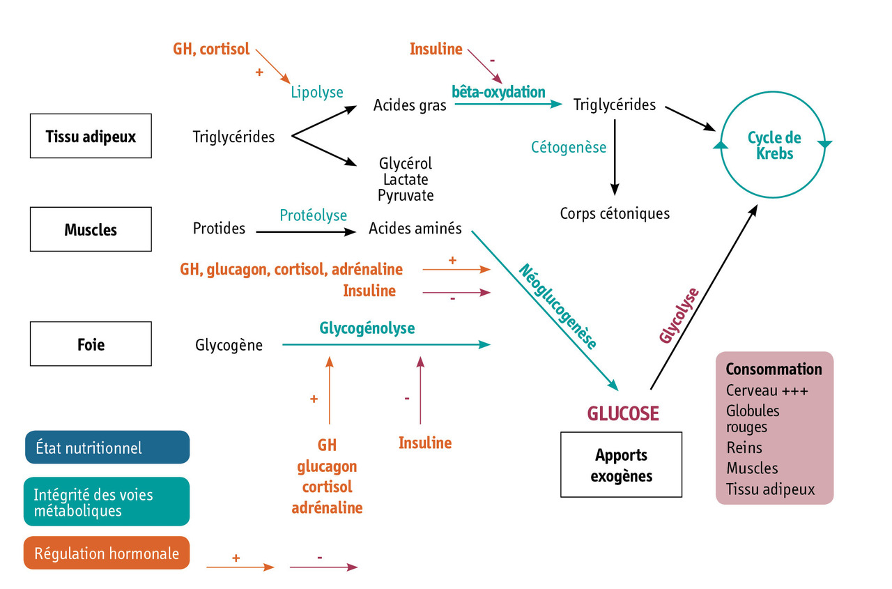 Au cours d’un jeûne prolongé (> 12 heures), la glycémie est maintenue grâce à la néoglucogenèse alimentée par la protéolyse et la lipolyse. Les acides gras libres augmentés permettent également la production de corps cétoniques, substrats alternatifs au glucose.
