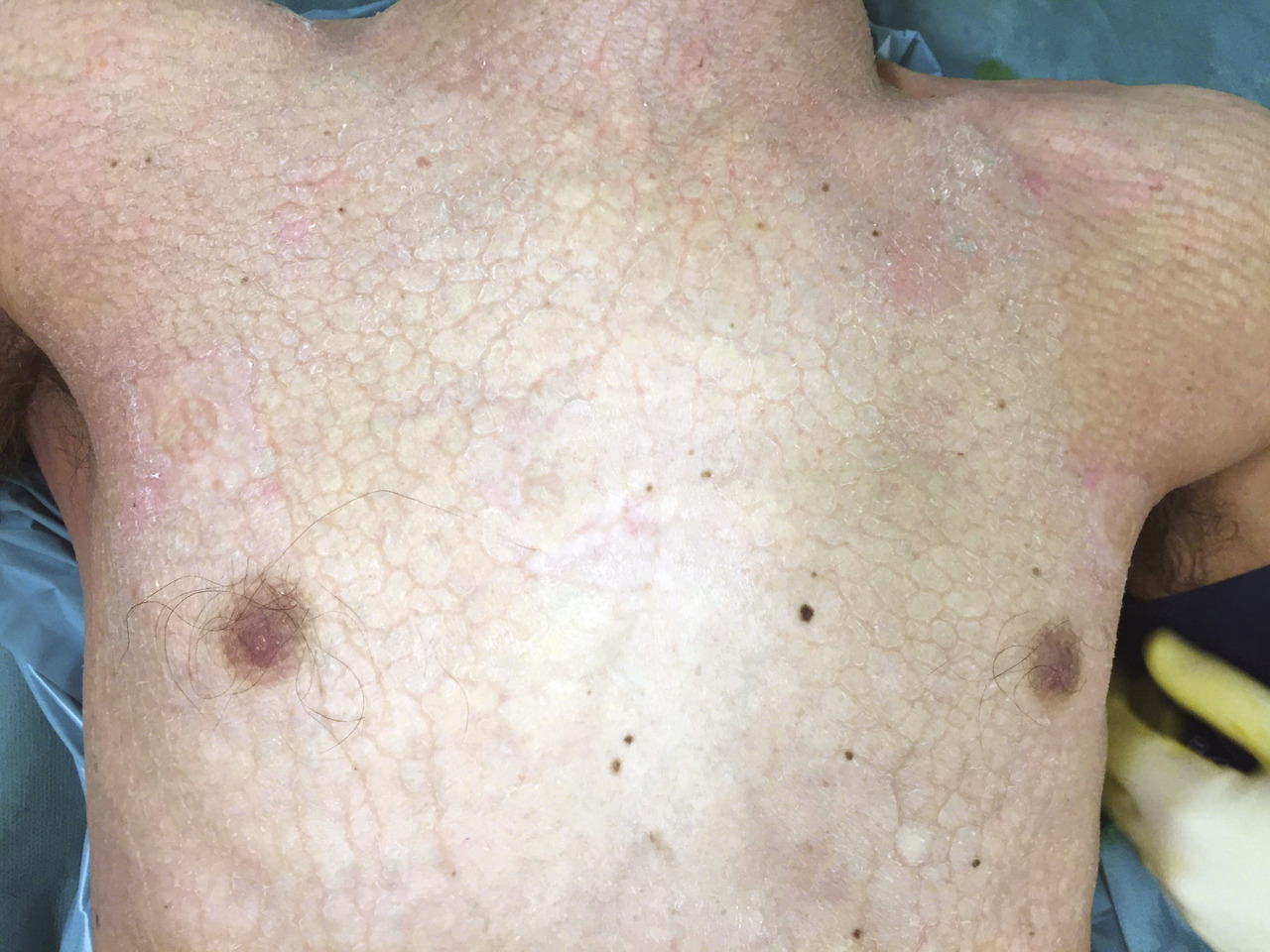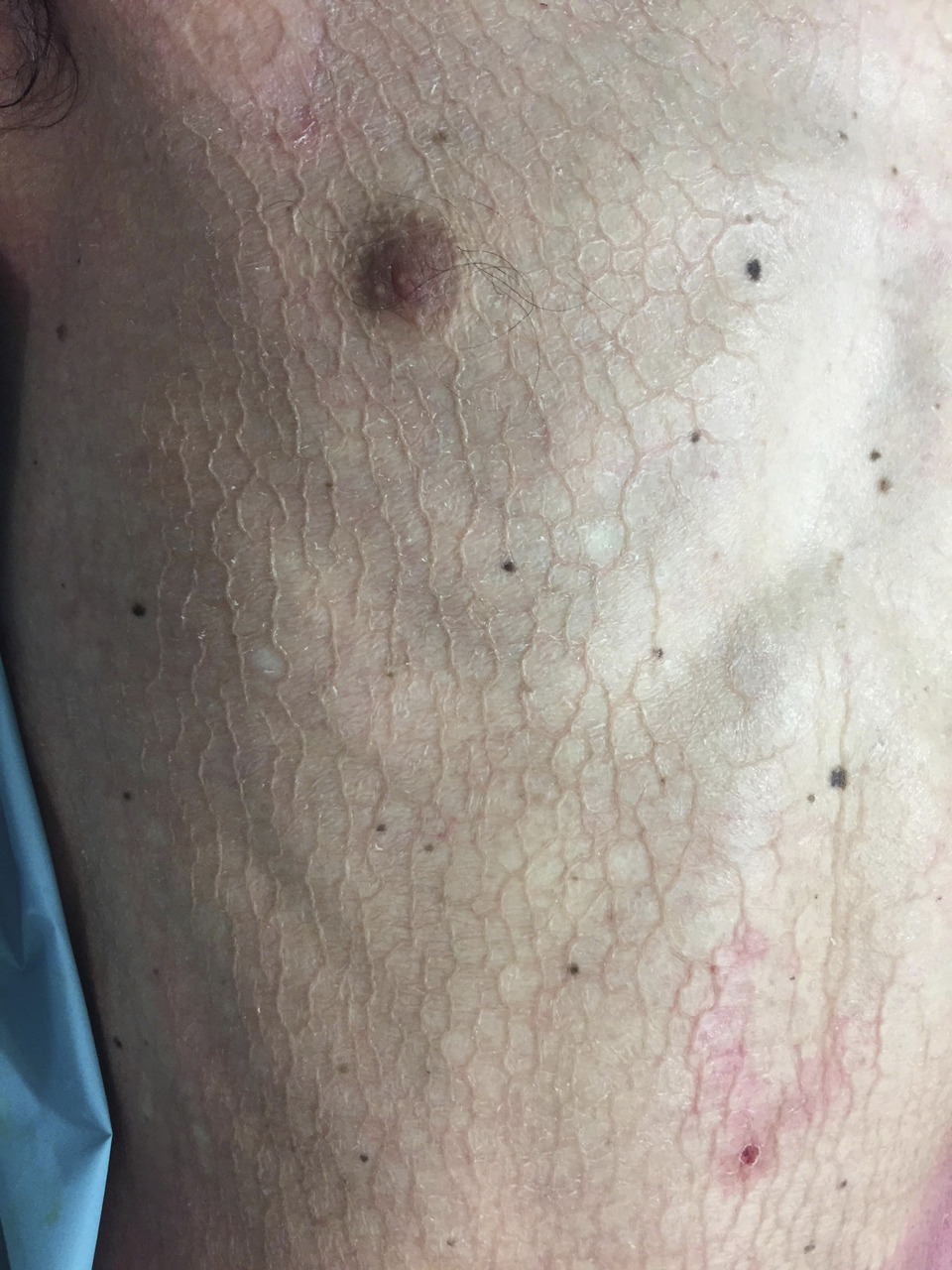 Un homme de 45 ans est hospitalisé pour la prise en charge de brûlures thermiques par liquide chaud. L’examen clinique initial révèle un aspect de « maillage » de sa peau laissant penser, l’espace d’un instant, qu’il a reçu une greffe cutanée par le passé (photos 1 et 2 ). Après examen plus fin et interrogatoire, une ichtyose est confirmée par le patient.