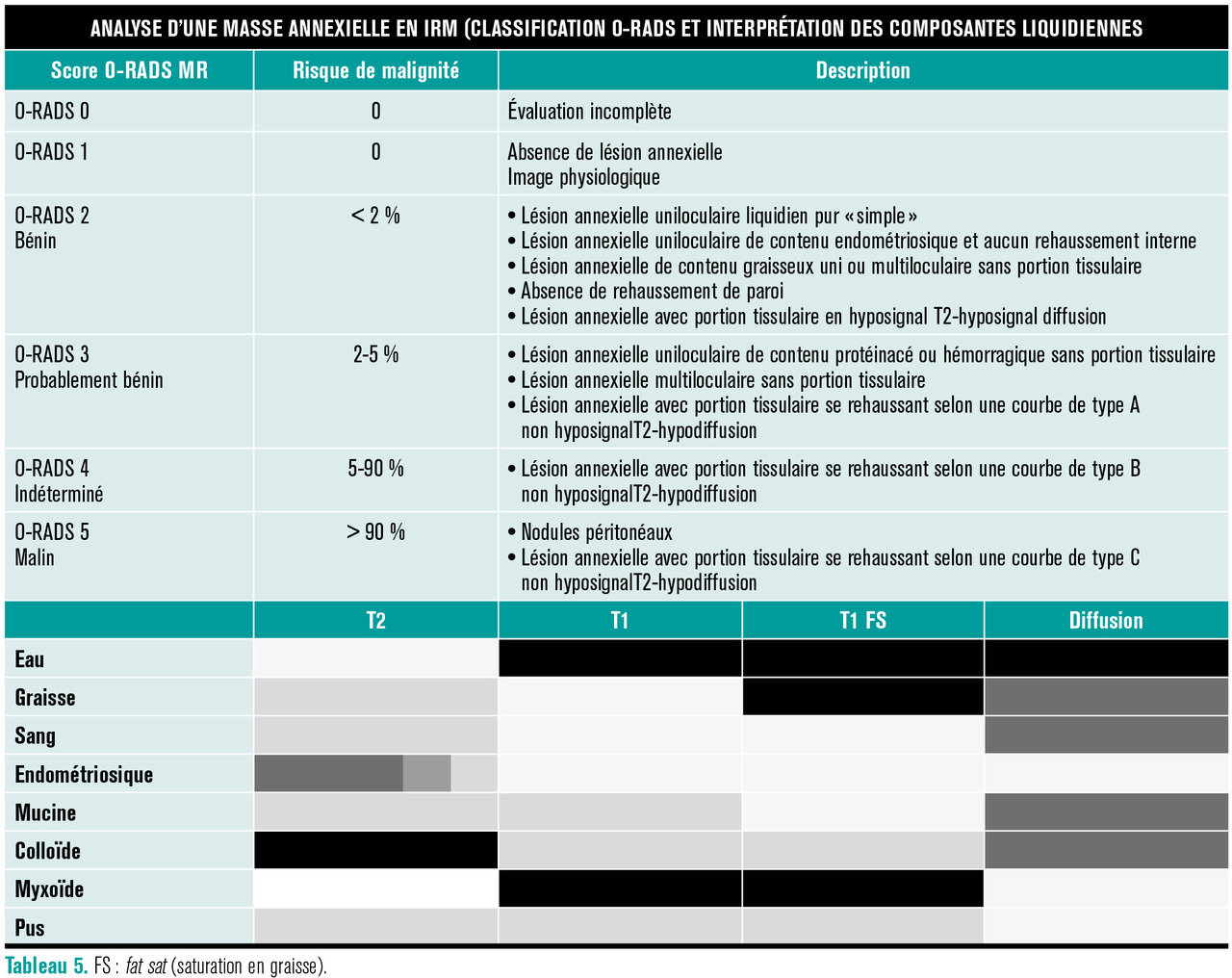 L’IRM pelvienne doit comprendre des séquences morphologiques classiques en pondération T2, T1 et T1 avec saturation de la graisse (fat sat [FS]) ainsi que des séquences fonctionnelles de diffusion et de perfusion permettant le calcul de courbes de rehaussement. L’analyse de la masse, de la portion liquidienne et d’une éventuelle portion tissulaire permet de lui attribuer un score O-RADS MR (ou O-RADS-IRM), pronostic du risque de malignité, afin de garantir la meilleure prise en charge possible (