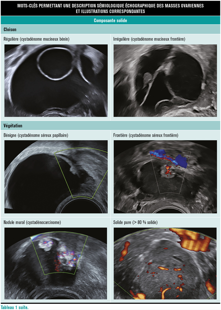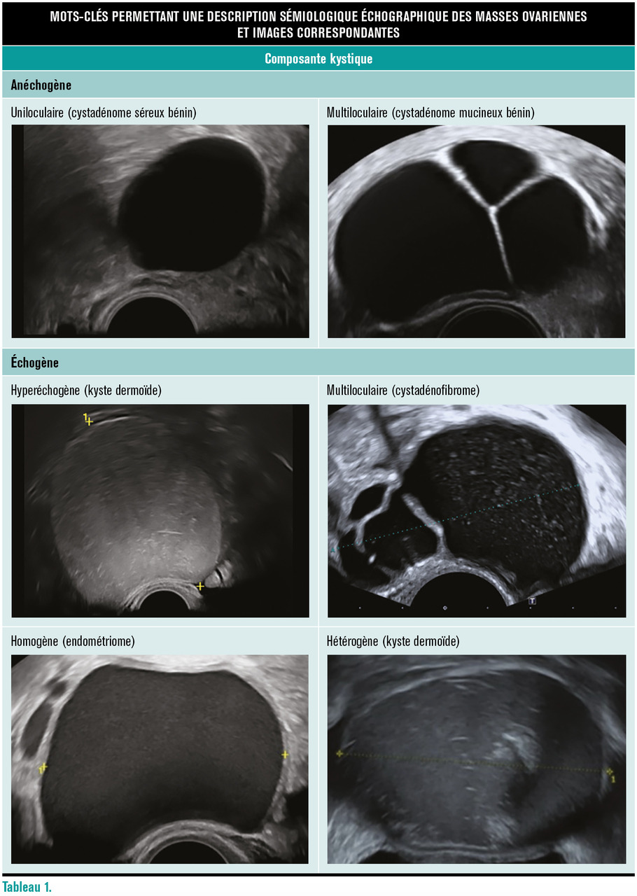 Les masses ovariennes peuvent être regroupées en six tableaux permettant d’évoquer des gammes diagnostiques : kystique uniloculaire liquidien pur, kystique uniloculaire liquidien impur, kystique multiloculaire sans portion tissulaire, kystique uni- ou multiloculaire avec végétations, masse mixte hétérogène avec nodule mural, et masse purement solide.