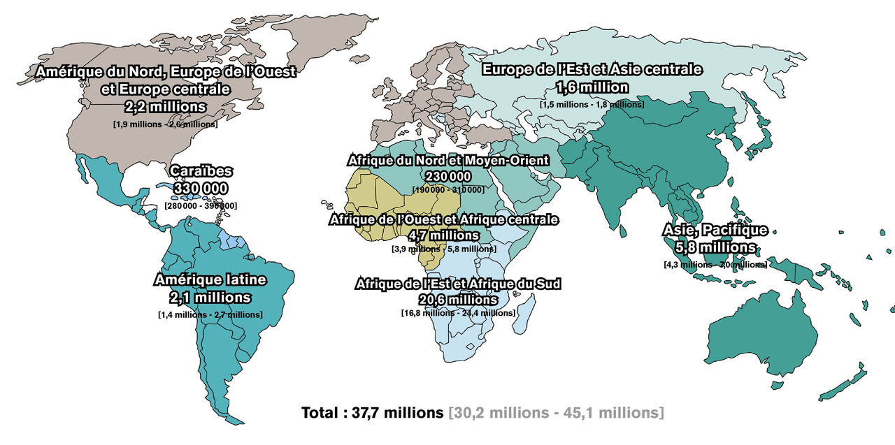 En 2020, dans le monde (fig. 1 ), on estime à 37,7 millions le nombre de personnes vivant avec le virus de l’immunodéficience humaine (PvVIH), dont 36 millions d’adultes et 1,7 million d’enfants de moins de 15 ans.1 Parmi cette population, dont la majorité vit en Afrique subsaharienne, environ 1 personne sur 5 ignore son statut vis-à-vis du VIH, soit 8 millions de personnes. De plus, environ 1,5 million d’individus se contaminent chaque année. Enfin, 680 000 PvVIH sont décédées de l’infection par le VIH en 2020. Ces chiffres alarmants ont été récemment publiés par l’ONUSIDA, dont l’objectif 90-90-90 n’est toujours pas atteint (soit 90 % des PvVIH connaissent leur statut vis-à-vis du VIH, 90 % d’entre elles ont accès à un traitement antirétroviral efficace et 90 % des PvVIH traitées ont une charge virale plasmatique indétectable). En effet, en 2020, sur l’ensemble des PvVIH, 84 % connaissaient leur statut, 73 % avaient accès à un traitement et 66 % avaient une charge virale indétectable.