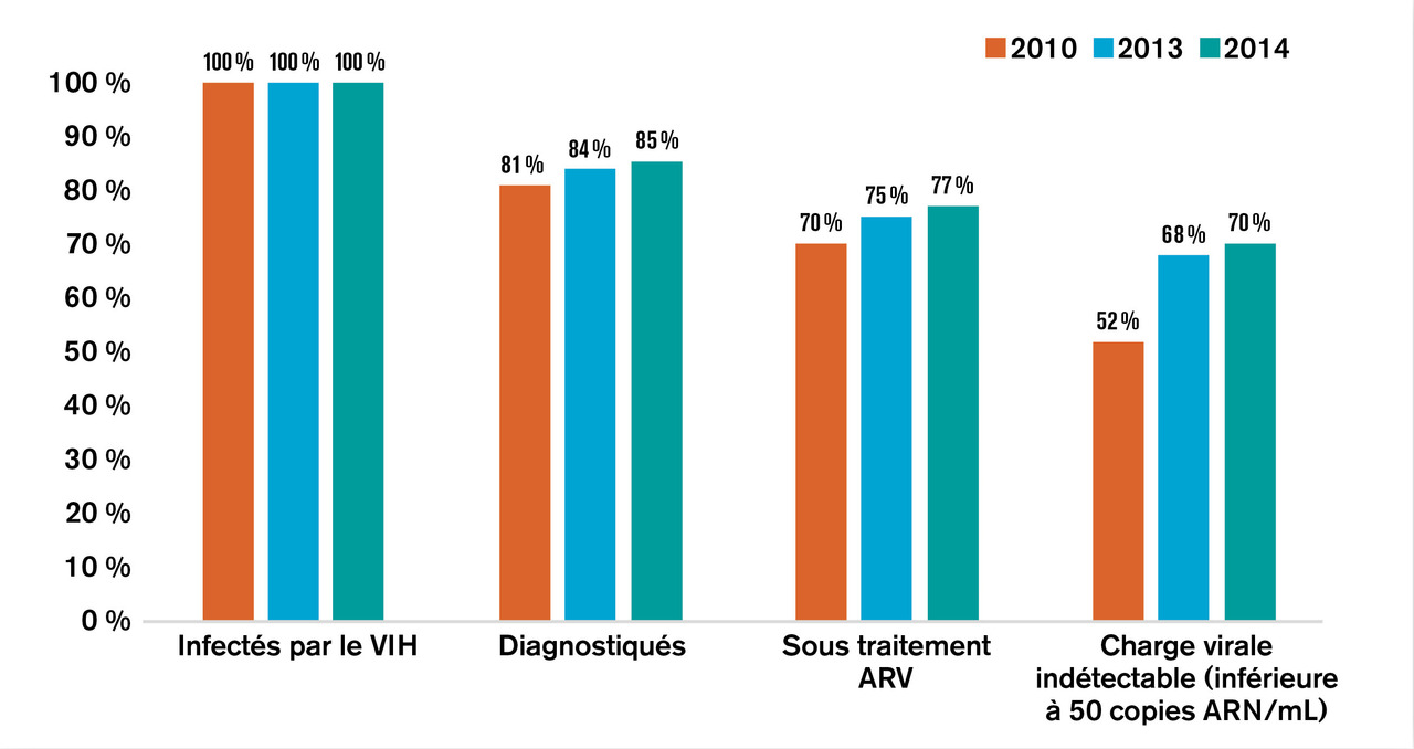 Le traitement universel comme outil de prévention de la transmission du VIH se heurte aux inégalités d’accès aux soins, notamment dans les pays à ressources limitées, au délai encore trop long entre l’infection par le VIH et son diagnostic (délai médian de 3,3 ans [écart interquartile : 1,2-5,7]), au délai entre le diagnostic et la mise sous traitement (délai médian de 1 à 5 mois) et enfin au délai entre la mise sous traitement et le contrôle de la charge virale du VIH (délai médian de 5 mois).8 À cette cascade de prises en charge qui retarde les objectifs fixés par l’ONUSIDA (90-90-90) s’ajoutent les diagnostics tardifs (on parle d’épidémie cachée), qui entraînent une perte de chance, à la fois pour l’individu et pour la collectivité (Prévention de la transmission mère-enfant (PTME)