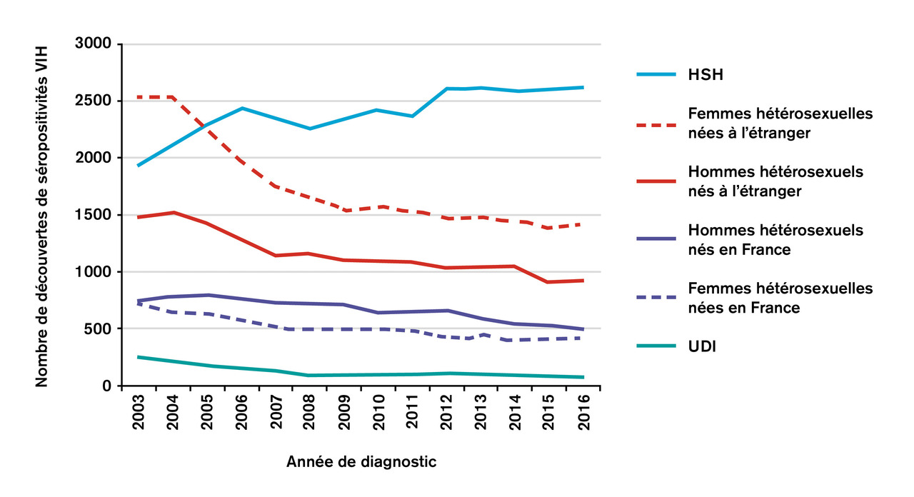 Parmi les nouveaux patients diagnostiqués, on note une diminution chez les HSH nés en France et les hommes hétérosexuels nés en France ou à l’étranger. En revanche, la situation reste préoccupante pour les femmes et les HSH nés à l’étranger, avec une augmentation de l’incidence ces dernières années.