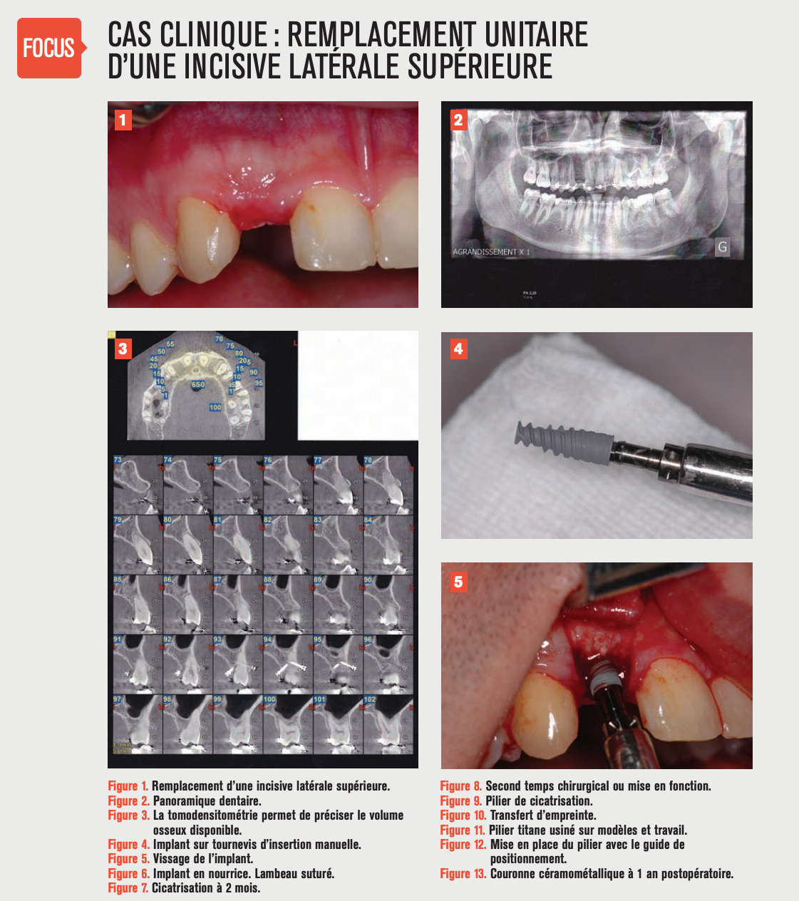 L’implant est une racine artificielle que l’on place dans l’os pour supporter une couronne et remplacer une ou plusieurs dents naturelles. Il est le plus souvent en titane mais il existe des implants en tantale ou en zircone. Vers 1950, le chirurgien suédois Per-Ingvar Brånemark a découvert que des vis en titane pouvaient se lier directement aux tissus vivants, en particulier à l’os. Il a nommé ce phénomène biologique « ostéo-intégration ». En 1965, les premiers implants ont été réalisés dans la bouche d’un patient suédois qui les a conservés pendant 40 ans. Depuis les années 1980, cette technique a été dif- fusée dans le monde entier et a fait ses preuves par la publication de très nombreuses études cliniques.