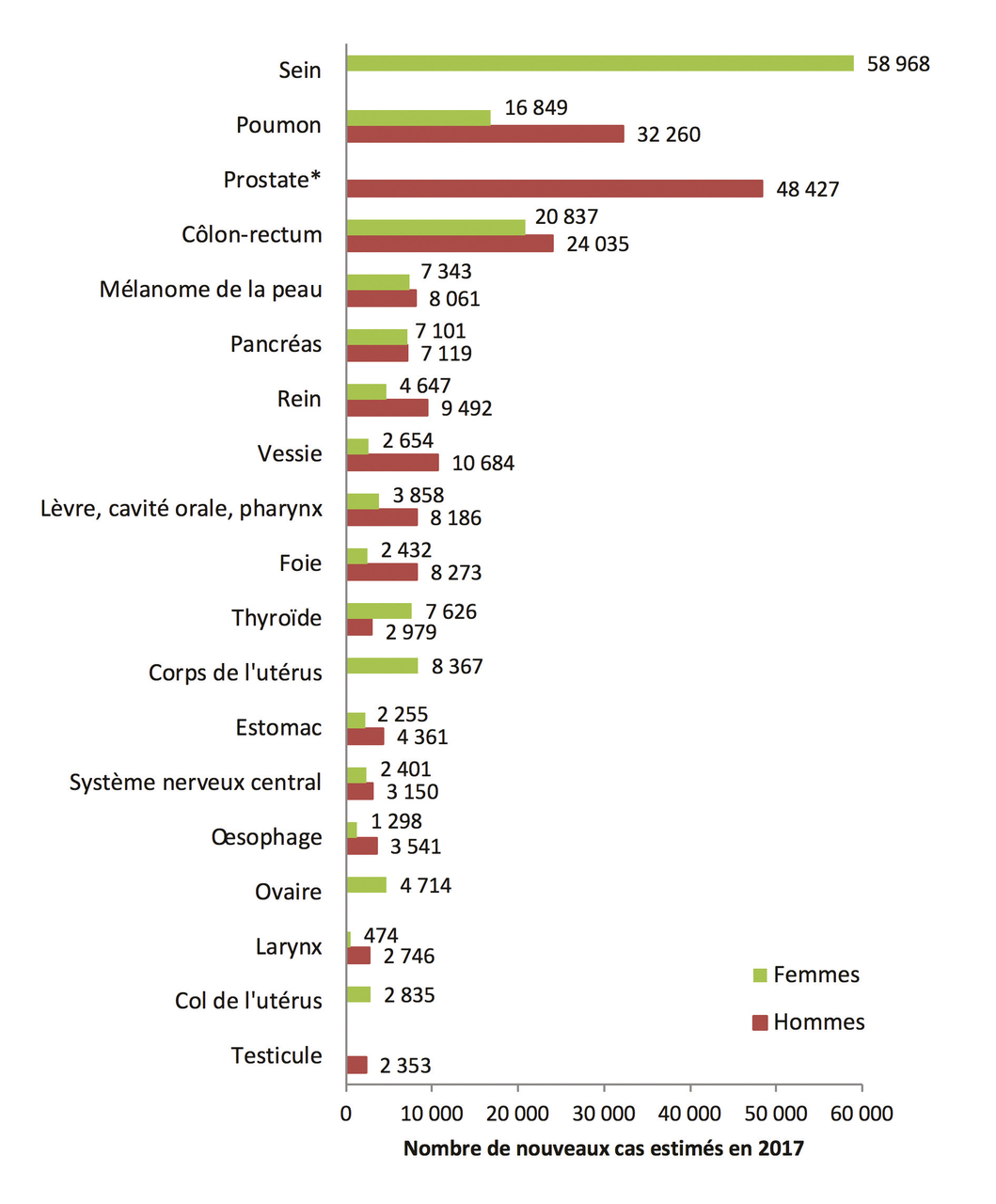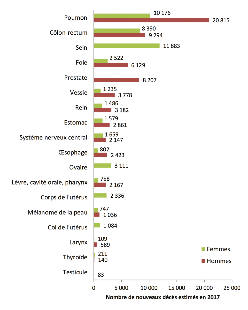 Même si une projection du nombre de cas de cancer de la prostate n’a pas pu être effectuée en 2017, celui-ci reste de loin le cancer le plus fréquent chez les hommes (48 427 nouveaux cas en 2013), devant les cancers du poumon et colorectaux (fig. 1).3 Avec près de 59 000 nouveaux cas estimés en 2017, le cancer du sein est le plus fréquent des cancers chez les femmes, devant les cancers colorectaux et du poumon. Le cancer du poumon est le cancer le plus meurtrier chez les hommes (20 815 décès), devant les cancers colorectaux et de la prostate (fig. 2). Chez les femmes, il s’agit des cancers du sein (11 883 décès), du poumon et colorectaux.