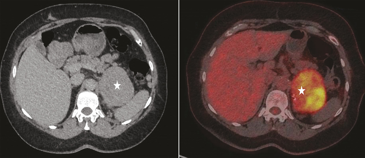 fig. 3 ).5 Si la valeur prédictive négative de la TEP est donc un argument fort en faveur de la bénignité, une augmentation de la captation du FDG n’est cependant pas spécifique et peut également s’observer, essentiellement en cas de phéochromocytome bénin mais aussi dans certains adénomes corticaux bénins ou hémorragies surrénaliennes, notamment.