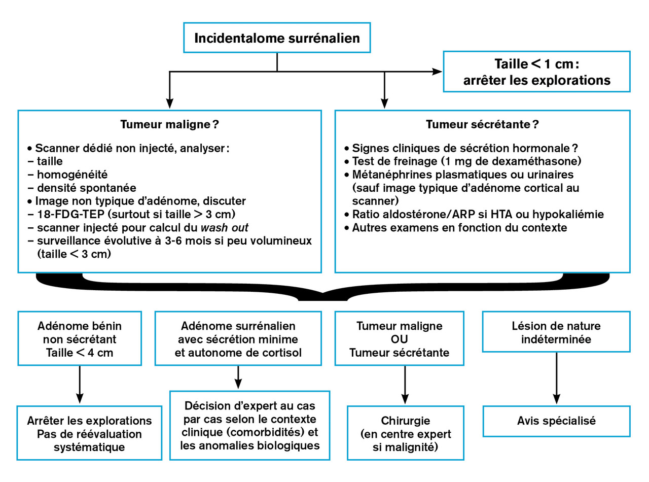 La découverte fortuite d’une masse surrénalienne lors d’une imagerie abdominale doit être appréhendée avec deux objectifs : éliminer une lésion délétère justifiant une exérèse chirurgicale ; éviter les examens et traitements inutiles.