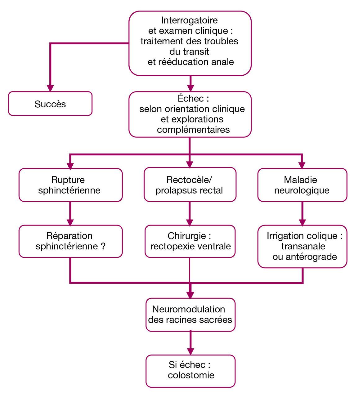 Si les symptômes persistent, une rééducation anale est proposée,5 le plus souvent par biofeedback (au moins 10 séances avant d’en évaluer l’efficacité). Le bénéfice de sa poursuite à long terme (entretien) est à préciser. En cas d’échec, les examens complémentaires guident le traitement de deuxième ligne (fig. 1).