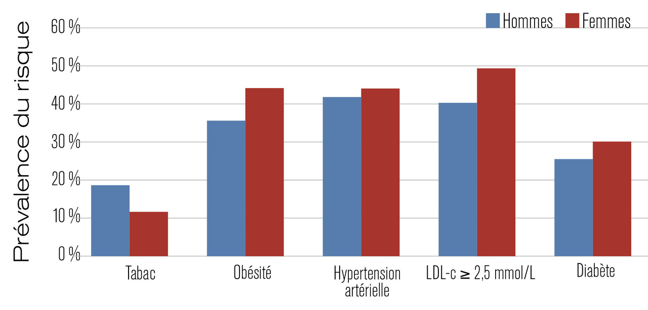 Passé la cinquième décennie, les femmes ont des niveaux de cholestérol total plus élevés, elles sont volontiers hypertendues et diabétiques. Ces facteurs de risque sont non seulement plus fréquents mais aussi plus sévères avec un pronostic plus sombre, notamment pour le diabète. En effet, la femme diabétique a un taux de mortalité d’origine coronaire supérieur à celui de l’homme. L’étude VIRGO,5 analysant l’IDM chez les jeunes (de 18 à 55 ans), montre une plus grande incidence du diabète, de l’obésité mais également du tabagisme chez les femmes comparées aux hommes du même âge. Or, l’effet du tabac semble particulièrement néfaste dans la population féminine, avec un risque d’infarctus multiplié par 1,57 par rapport à l’homme, davantage majoré avant 55 ans.