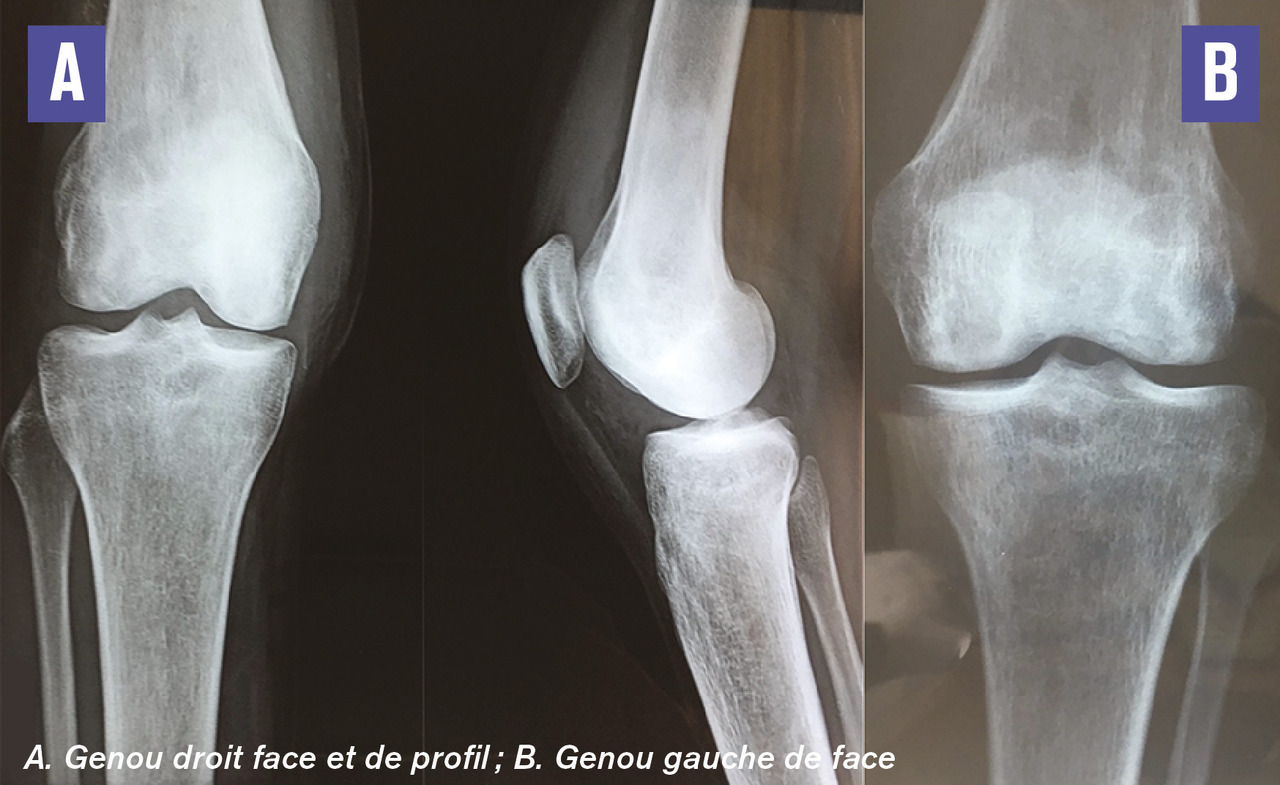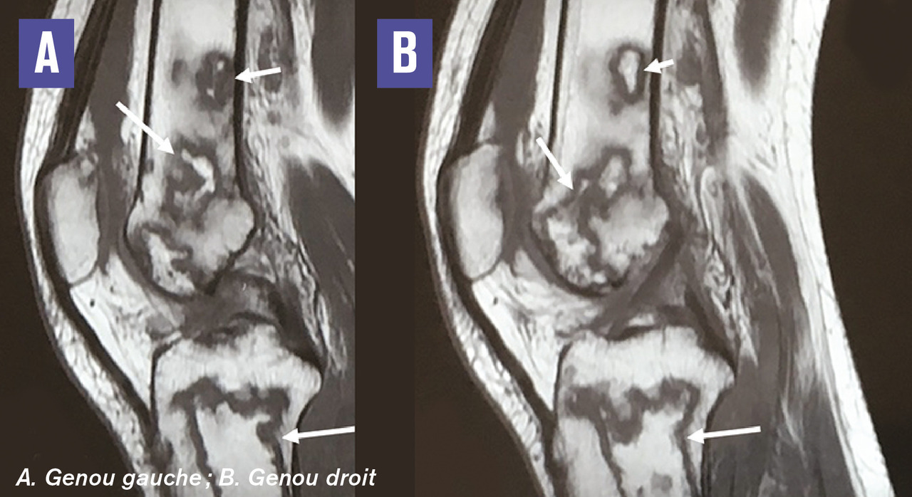 Cette femme de 24 ans consultait pour des gonalgies bilatérales mécaniques évoluant depuis 3 mois. La patiente était maigre (IMC à 14), sa marche était précautionneuse, sans trouble neurologique. L’interrogatoire notait un tabagisme chronique depuis l’âge de 18 ans et une corticothérapie en automédication à raison de 40 mg/j pendant 18 mois. La fonction articulaire était bonne, douloureuse à la mobilisation des genoux. Il n’y avait pas d’épanchement articulaire ni de signes en relation avec une maladie de système ou de surcharge. La radiographie notait quelques plages d’ostéocondensation inhomogènes des condyles fémoral et tibial droits, et une déminéralisation osseuse hétérogène des deux condyles fémoraux et du plateau tibial gauche (fig. 1 ). L’IRM montrait des images d’os dans l’os caractéristiques d’infarctus osseux (fig. 2 ). Le bilan biologique et l’échographie abdominale étaient normaux. Les autres causes ayant été exclues en raison de la normalité des explorations, les infarctus osseux étaient liés à la corticothérapie au long cours.
