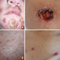 - l’épidermolyse bulleuse staphylococcique ou SSSS (staphylococcal scalded skin syndrome) : surtout chez le jeune enfant, altération de l’état général, fièvre, exanthème scarlatiniforme débutant dans les plis, avec décollement superficiel et présence d’un signe de Nikolsky. Chez l’adulte, l’insuffisance rénale et une immunodépression sont les facteurs favorisants ;