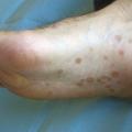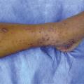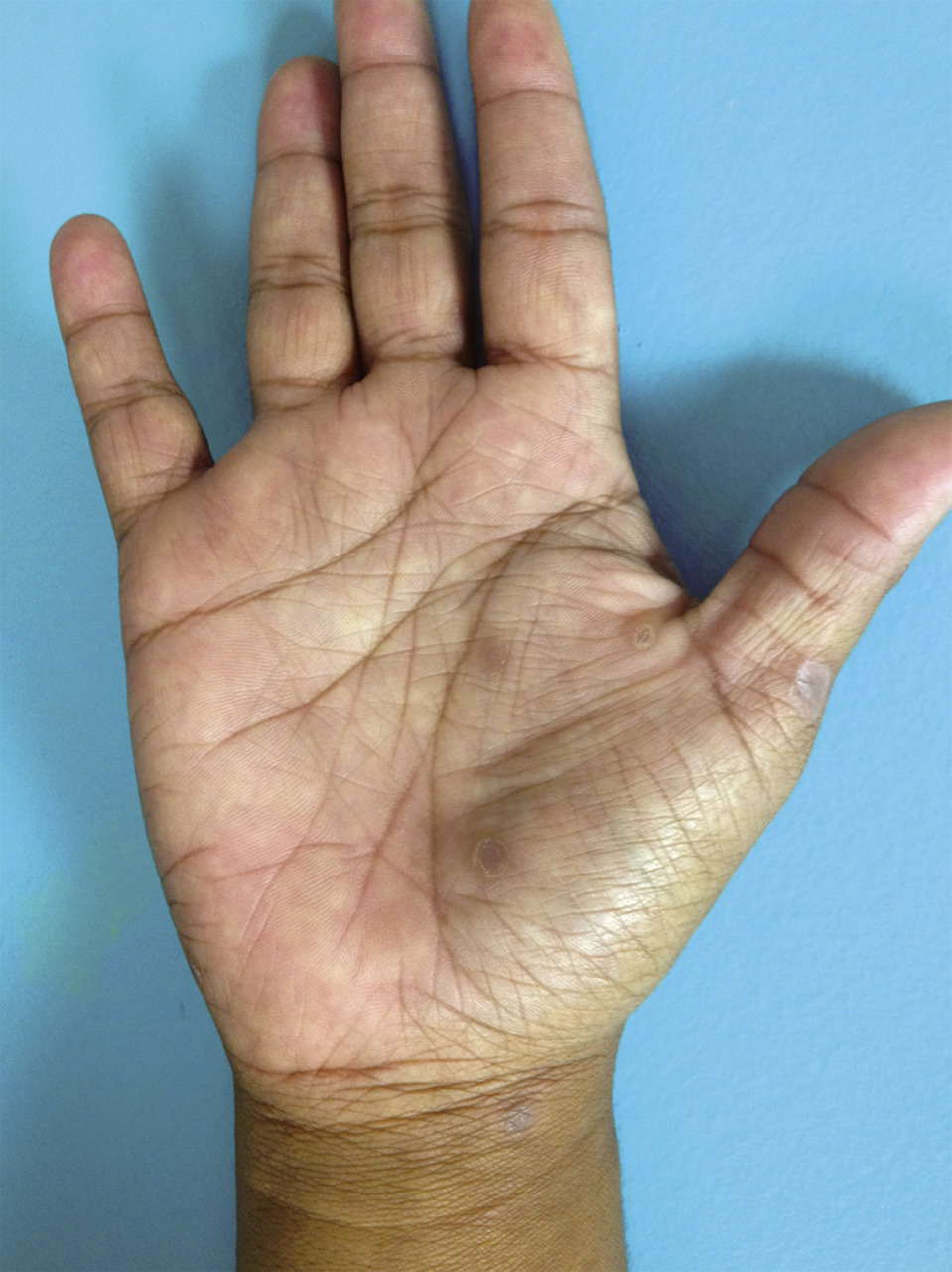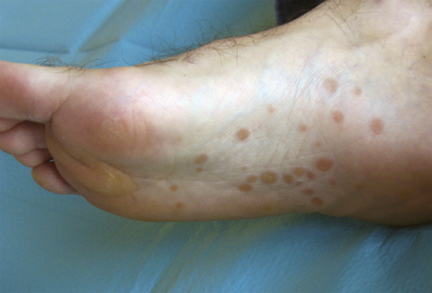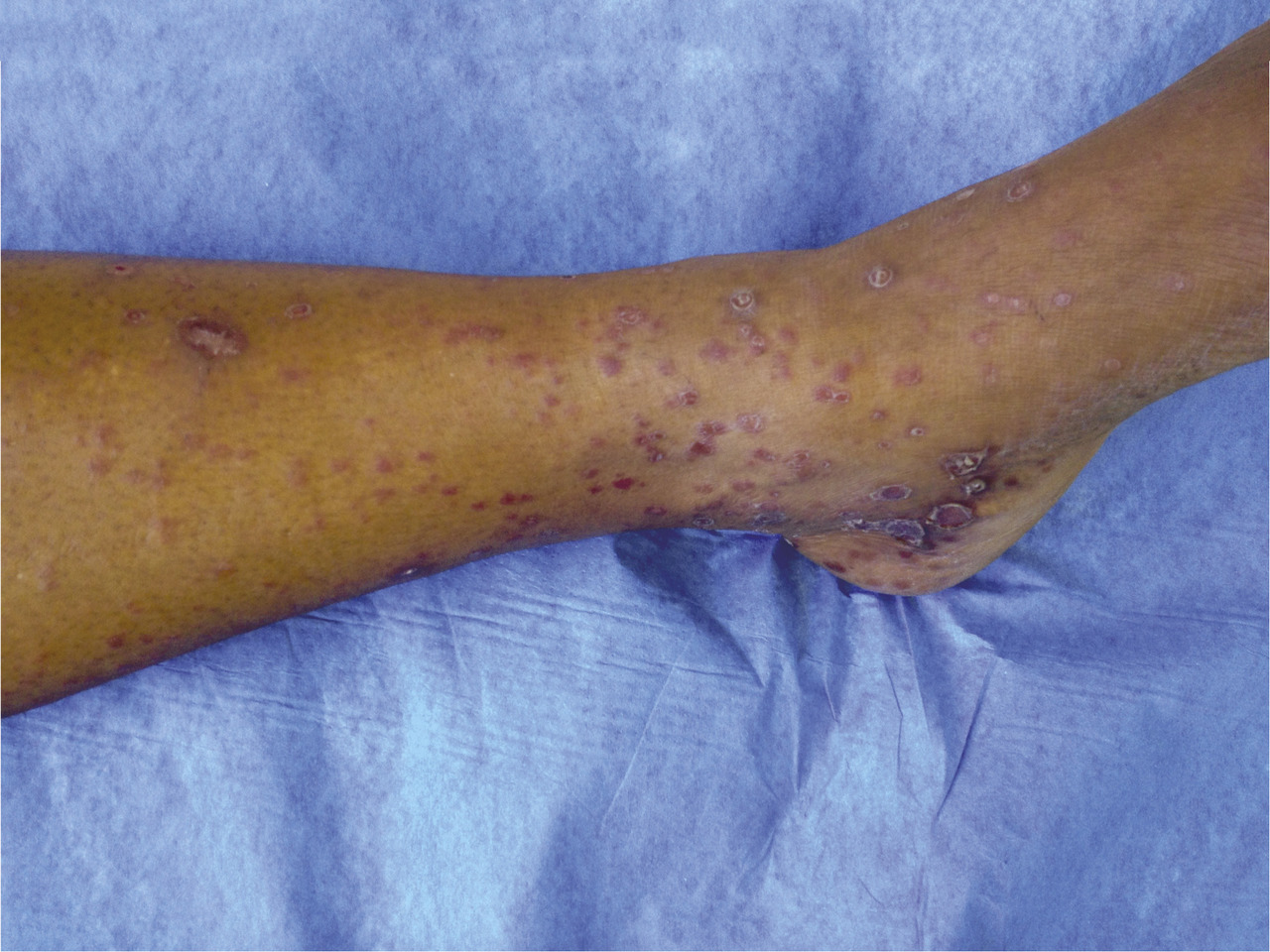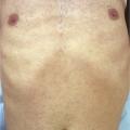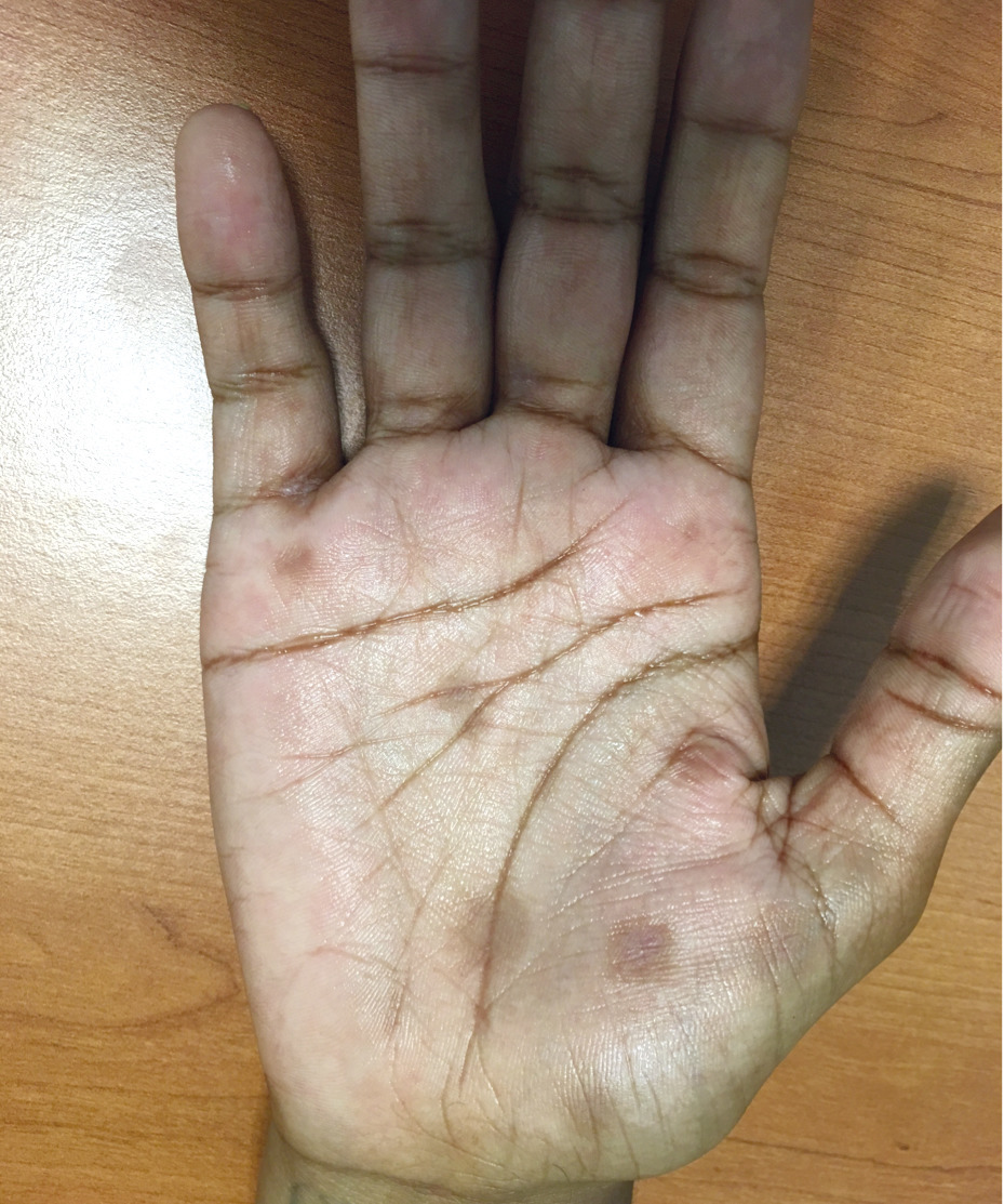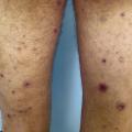 fig. 9-10 ) : évoquant une acné, une dermatite séborrhéique, une varicelle, une leucémie aiguë, un lichen, un psoriasis, un parapsoriasis en gouttes… Les lésions sont rarement prurigineuses, prédominant sur le tronc et le visage. L’atteinte palmoplantaire est fréquente mais parfois discrète (fig. 11-13 ). Les lésions cutanées ne sont contagieuses que si elles sont excoriées, érosives ou ulcérées.