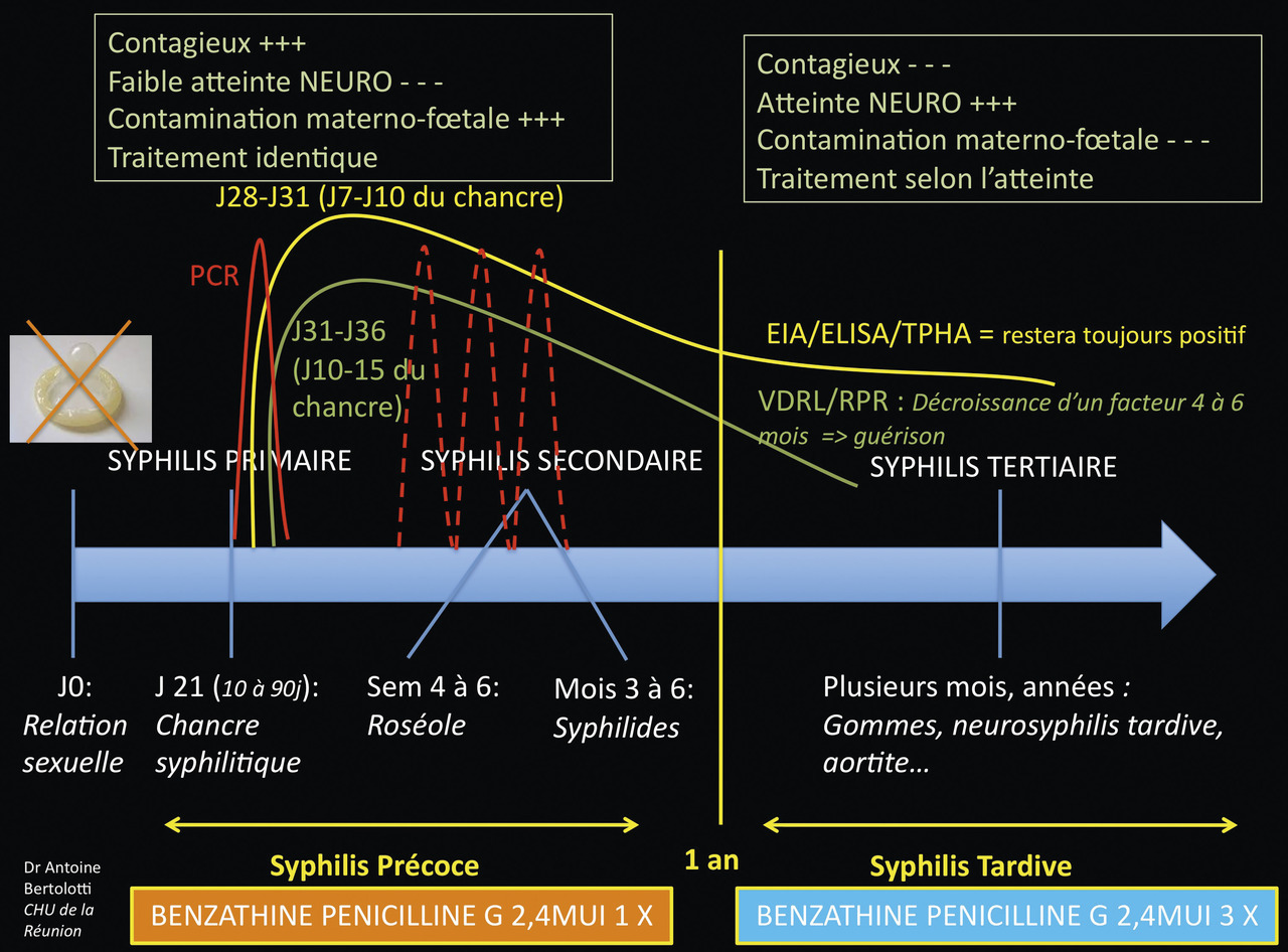 Janier M, Dupin N, NSpenatto N, Vernay-Vaisse C, Bertolotti A, Derancourt C et la section MST de la SFD. Syphilis précoce - recommandations. Ann Derm Venereol, 2016;133(Suppl. 8/9):2S1-71.