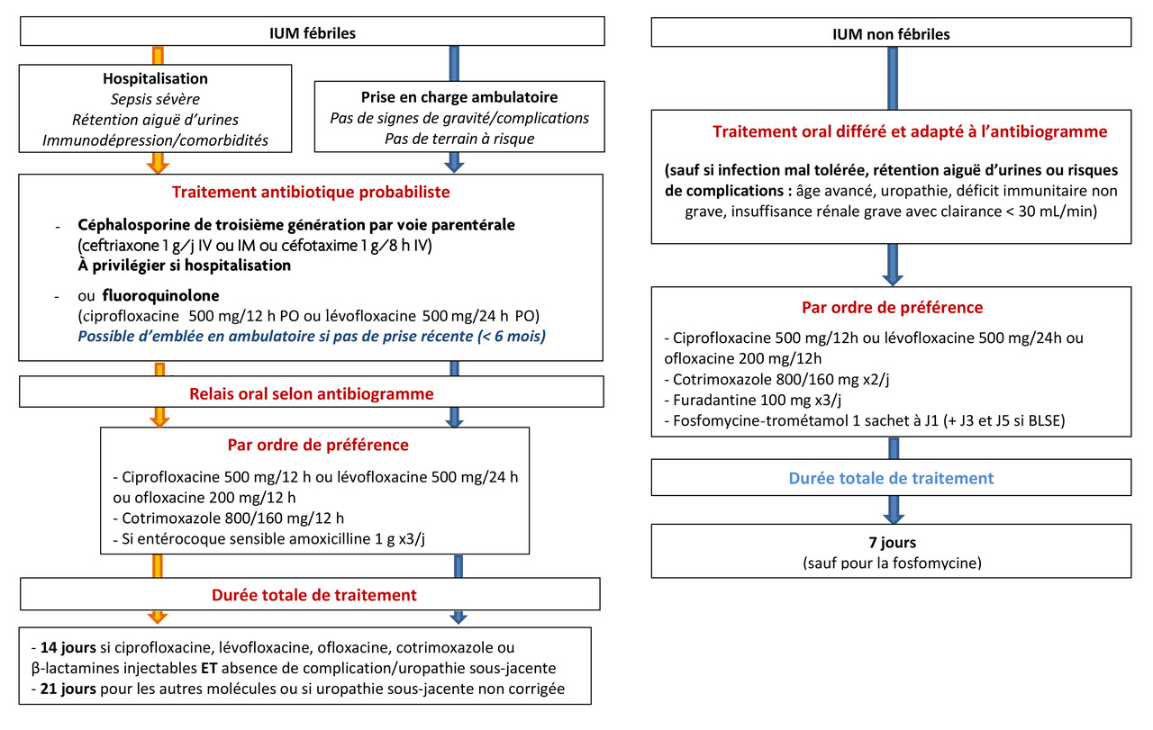 Pour les IUM non fébriles, il est recommandé de différer le traitement en attendant les résultats de l’ECBU. Selon l’antibiogramme, on prescrit la nitrofurantoïne, (Furadantine) le cotrimoxazole ou une FQ.2