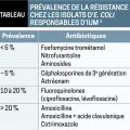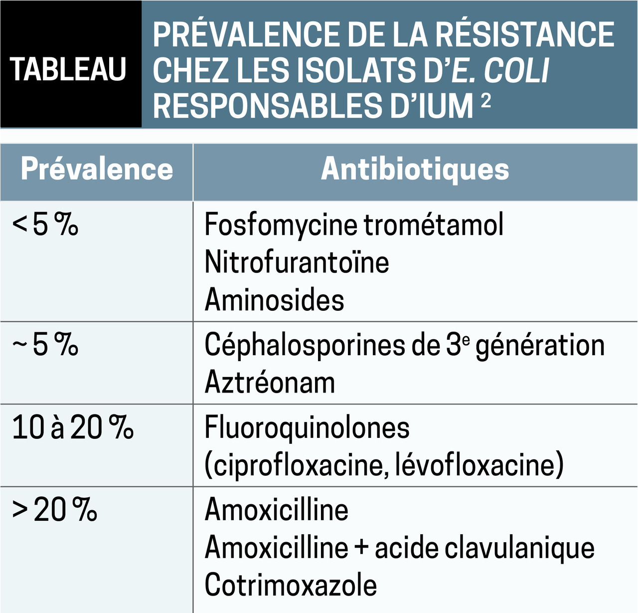 L’antibiorésistance des souches d’E. coli isolées des IUM communautaires est croissante (tableau ).5 La résistance du colibacille est plus fréquente chez l’homme que chez la femme (11 % vs 6 % pour le céfotaxime, 19 % vs 13 % pour la ciprofloxacine), et augmente également avec l’âge (8,2 % de souches productrices de β-lactamases à spectre élargi [BLSE] chez les 86-95 ans).