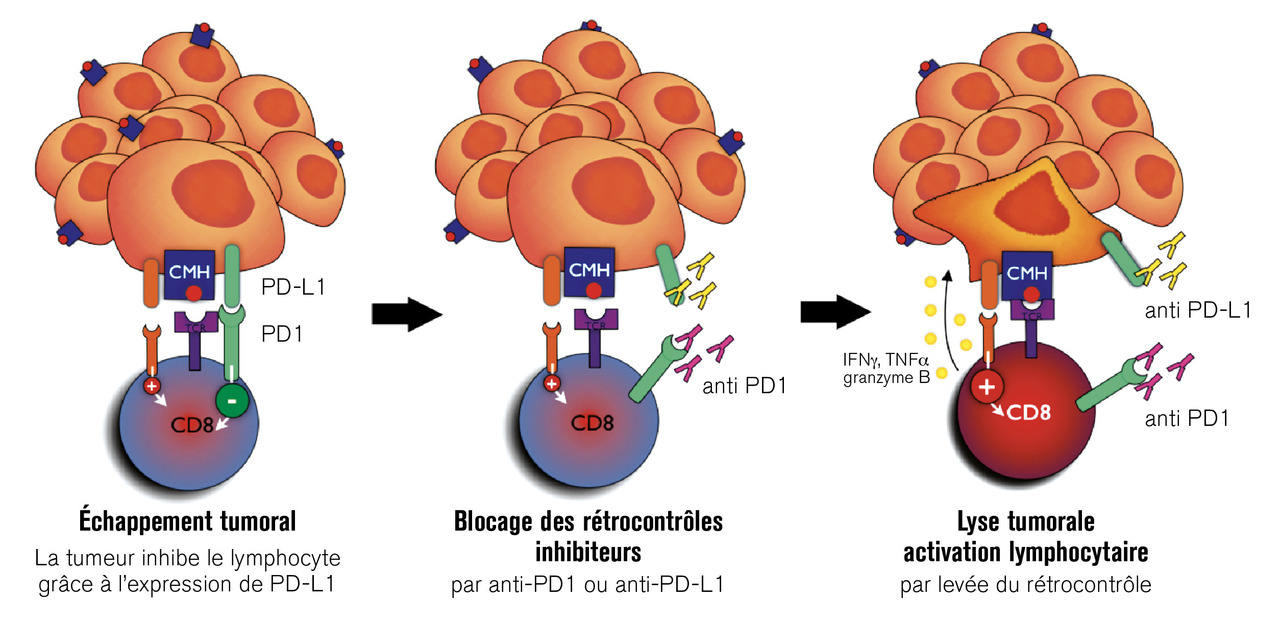 1 La surveillance immunitaire des cancers, qui est longtemps restée une hypothèse, est actuellement une réalité. On considère qu’il existe trois phases, les trois E : élimination des cellules cancéreuses par le système immunitaire ; équilibre entre cellules cancéreuses et système immunitaire ; échappement, correspondant à la phase clinique. Cet échappement est dû (au moins en partie) à un blocage de l’activation du système immunitaire par le micro-environnement tumoral par l’intermédiaire des récepteurs inhibiteurs du contrôle immunitaire.
