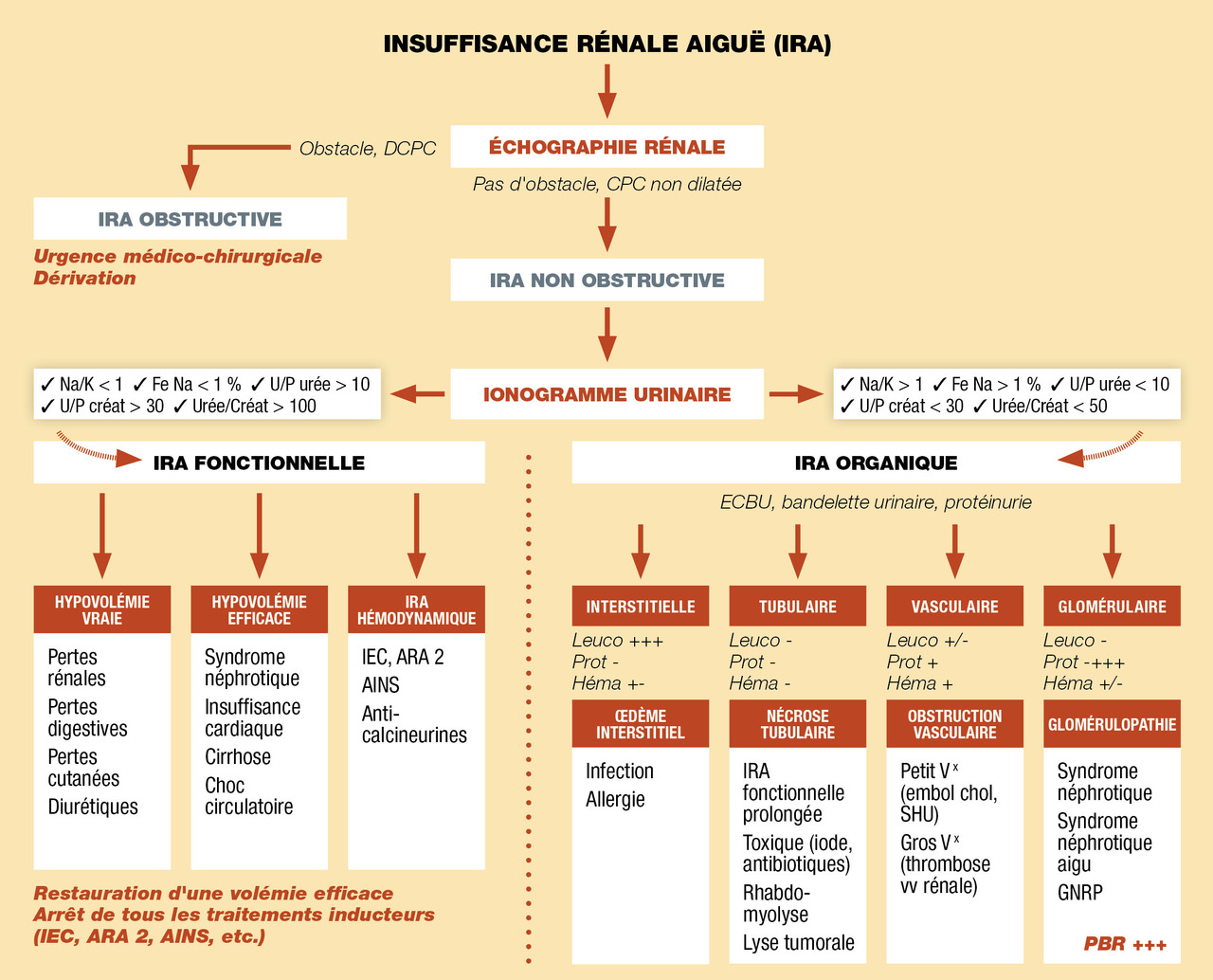 Il faut ensuite écarter l’insuffisance rénale aiguë fonctionnelle principalement par l’anamnèse et l’examen clinique mais en s’aidant des critères biologiques (ionogramme urinaire par exemple).