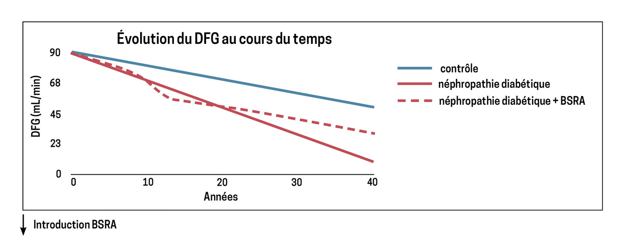 À l’inverse, les BSRA doivent la plupart du temps être maintenus même si la fonction rénale se dégrade du fait de l’évolution « naturelle » de la maladie rénale chronique. Il semblerait en effet que le bénéfice en matière de mortalité et de survenue d’événements cardiovasculaires persiste, même chez les patients devant débuter la dialyse.3