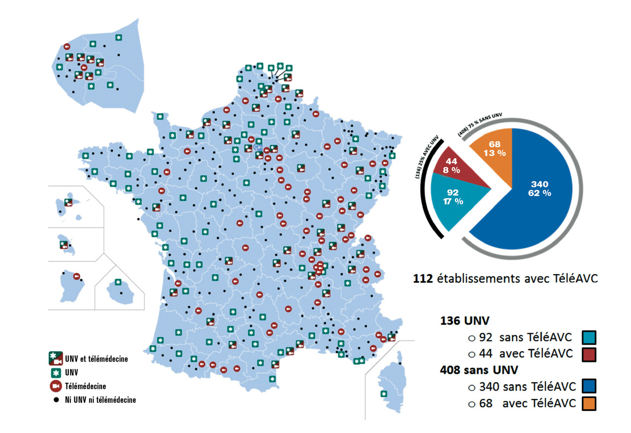 Ces expériences montrent que la télémédecine aide à structurer la prise en charge des patients admis dans des centres hospitaliers sans UNV. Ainsi, l’European Stroke Organisation (ESO) a proposé des recommandations sur le déploiement du télé-AVC.13 Ainsi, sont distinguées parmi les centres hospitaliers distants sans UNV, deux catégories (niveaux 0 et 1) : les centres de niveau 0 accueillent les patients suspects d’AVC dans un service d’accueil d’urgence, réalisent une biologie et une imagerie cérébrale (au minimum une tomodensitométrie) et requièrent un avis neurovasculaire en télémédecine. Le patient est alors acheminé systématiquement vers l’UNV la plus proche ; les centres de niveau 1 pour lesquels les patients suspects d’AVC et après avis neurovasculaire en télémédecine, s’ils ne sont pas transférés, sont accueillis au sein d’une unité géographiquement déterminée, avec des personnels médicaux et paramédicaux formés à la pathologie neurovasculaire. La présence neurologique sur site n’est souvent pas disponible 7 jours sur 7, et le suivi neurovasculaire peut avoir lieu en présentiel ou en télémédecine.13
