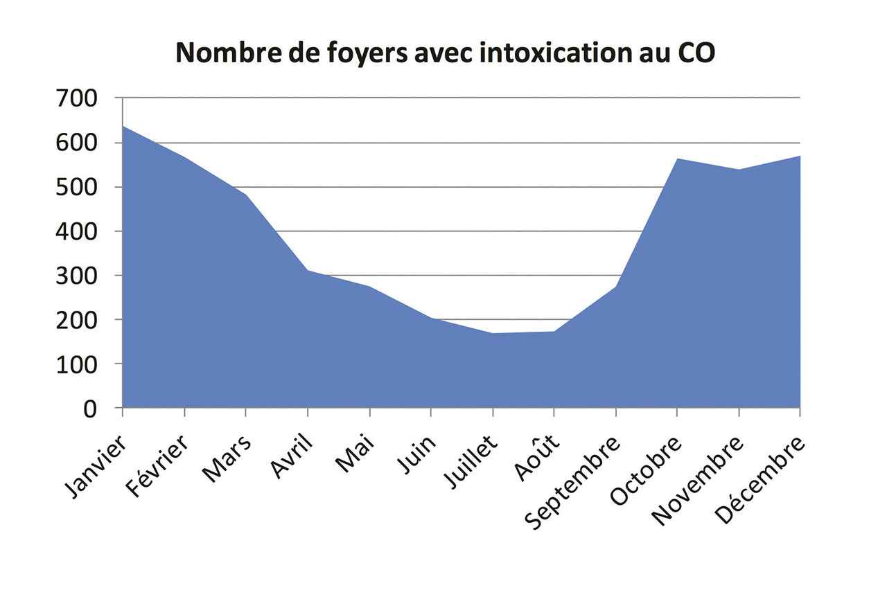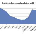 La région Nord-Pas-de-Calais connaissant un nombre particulièrement élevé d’intoxications au CO, un réseau de surveillance de ces intoxications a été mis en place dès 1986. C’est actuellement l’agence régionale de santé (ARS) qui collecte les données et coordonne les prises en charge. Ce réseau a permis une approche plus précise de l’épidémiologie de cette intoxication. D’après ce système de surveillance, le CO a été responsable ces 10 dernières années (2005-2015) de 11 404 intoxications (dont 2 478, soit 22,5 %, touchaient des enfants), réparties de manière homogène sur 10 ans mais avec une tendance à la diminution sur les 5 dernières années (fig. 1). Il existe une incidence bien plus importante les mois de chauffe, d’octobre à avril (fig. 2).