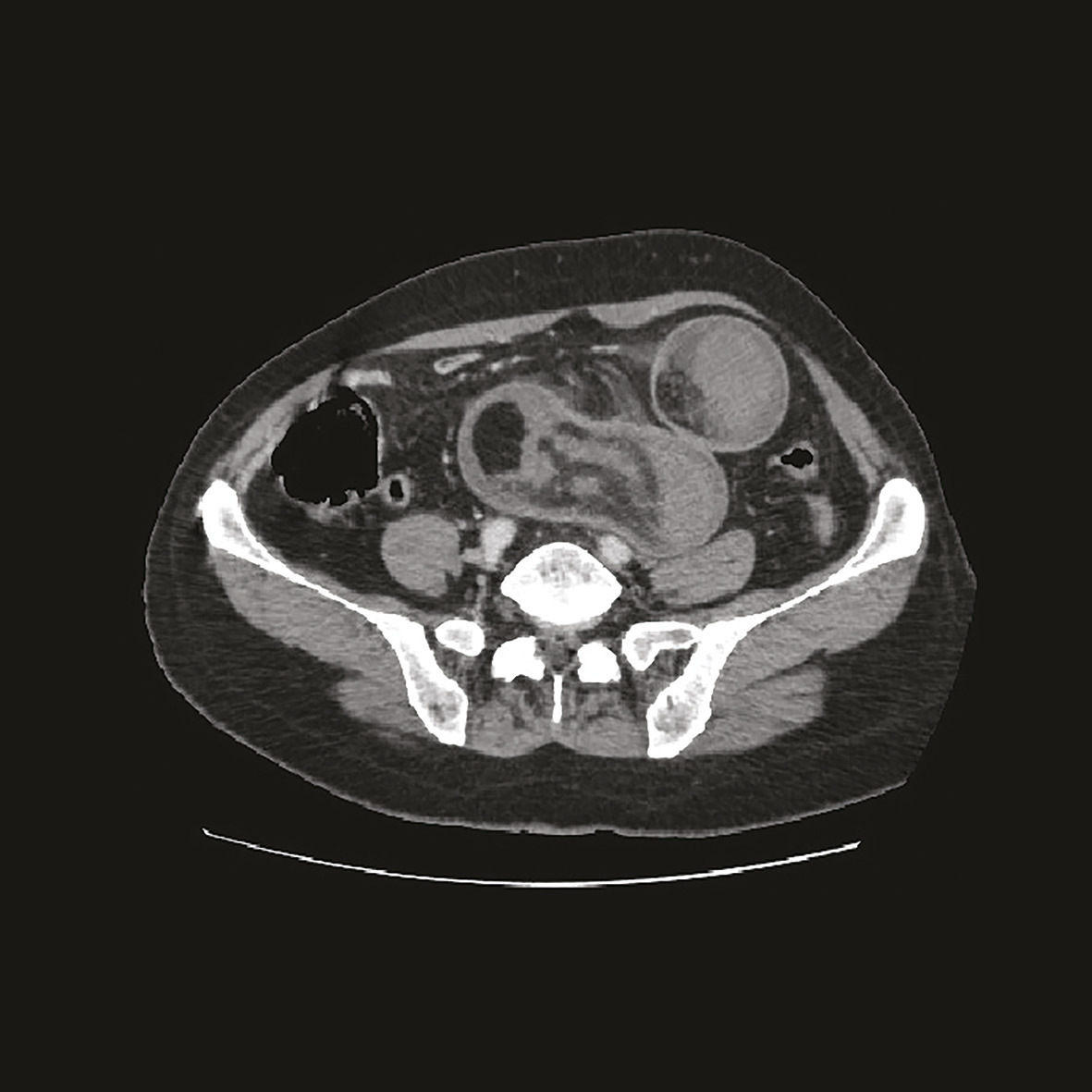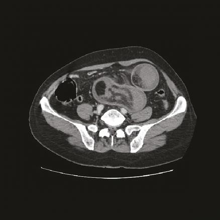 L’invagination intestinale est définie par le télescopage et la pénétration d’un segment intestinal dans le segment d’aval. Elle survient essentiellement chez le nourrisson (80 % entre 6 mois et 2 ans).1 L’atteinte de l’adulte est rare. Selon les études précédentes, 1 et 5 % des invaginations intestinales aiguës s’observent chez l’adulte contre plus de 95 % chez l’enfant. Un lipome en est exceptionnellement la cause.2 Le diagnostic se fait par l’imagerie, plus rarement par la chirurgie. La TDM montre une masse tissulaire avec une alternance de zones concentriques en cocarde surmontée d’une image en croissant excentrée de densité graisseuse correspondant au boudin.1 Le traitement est chirurgical chez l’adulte, les causes organiques sous-jacentes étant les plus fréquentes.