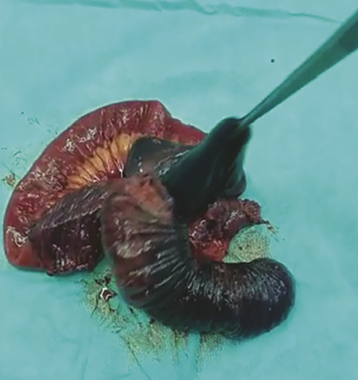 Cette femme de 62 ans était admise aux urgences pour des douleurs abdominales, des vomissements alimentaires et un arrêt des gaz, depuis 2 jours, sans fièvre. Elle avait pour antécédents une gastrite chronique, des douleurs abdominales intermittentes chroniques. L’examen notait une distension abdominale, une sensibilité abdominale diffuse ; les orifices herniaires étaient libres et l’ampoule rectale vide, sans melaena ni rectorragies. La pression artérielle était à 130/70 mmHg. L’échographie abdominale montrait une masse de la fosse iliaque gauche. La tomodensitométrie (TDM) abdominale révélait une masse ovalaire, hypodense, multistratifiée, avec un aspect en cocarde, ayant en son sein une incarcération mésentérique et en périphérie une lésion graisseuse en rapport avec un lipome (fig. 1 ). Le diagnostic d’invagination iléo-iléal secondaire à un lipome était évoqué. Une résection chirurgicale de 100 cm de grêle était réalisée (fig. 2 ).