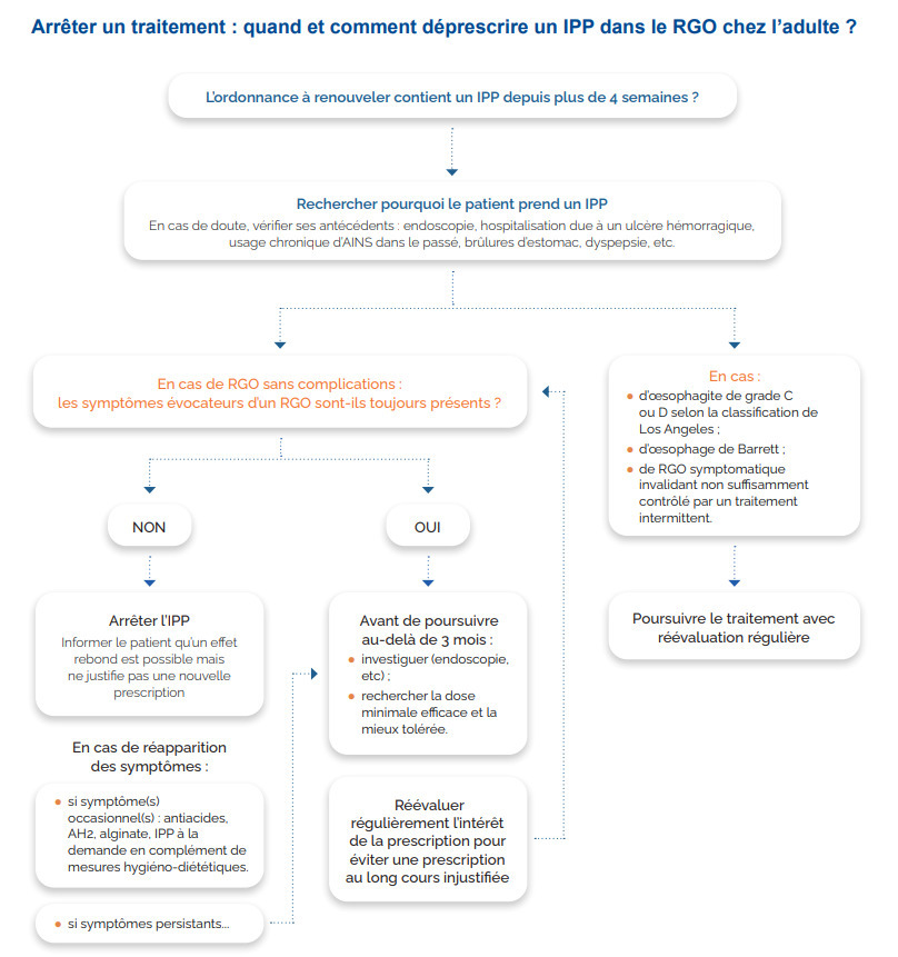 3. RGO : le traitement initial est de 4 semaines. Sa poursuite est rarement justifiée, notamment chez les sujets âgés polymédiqués.