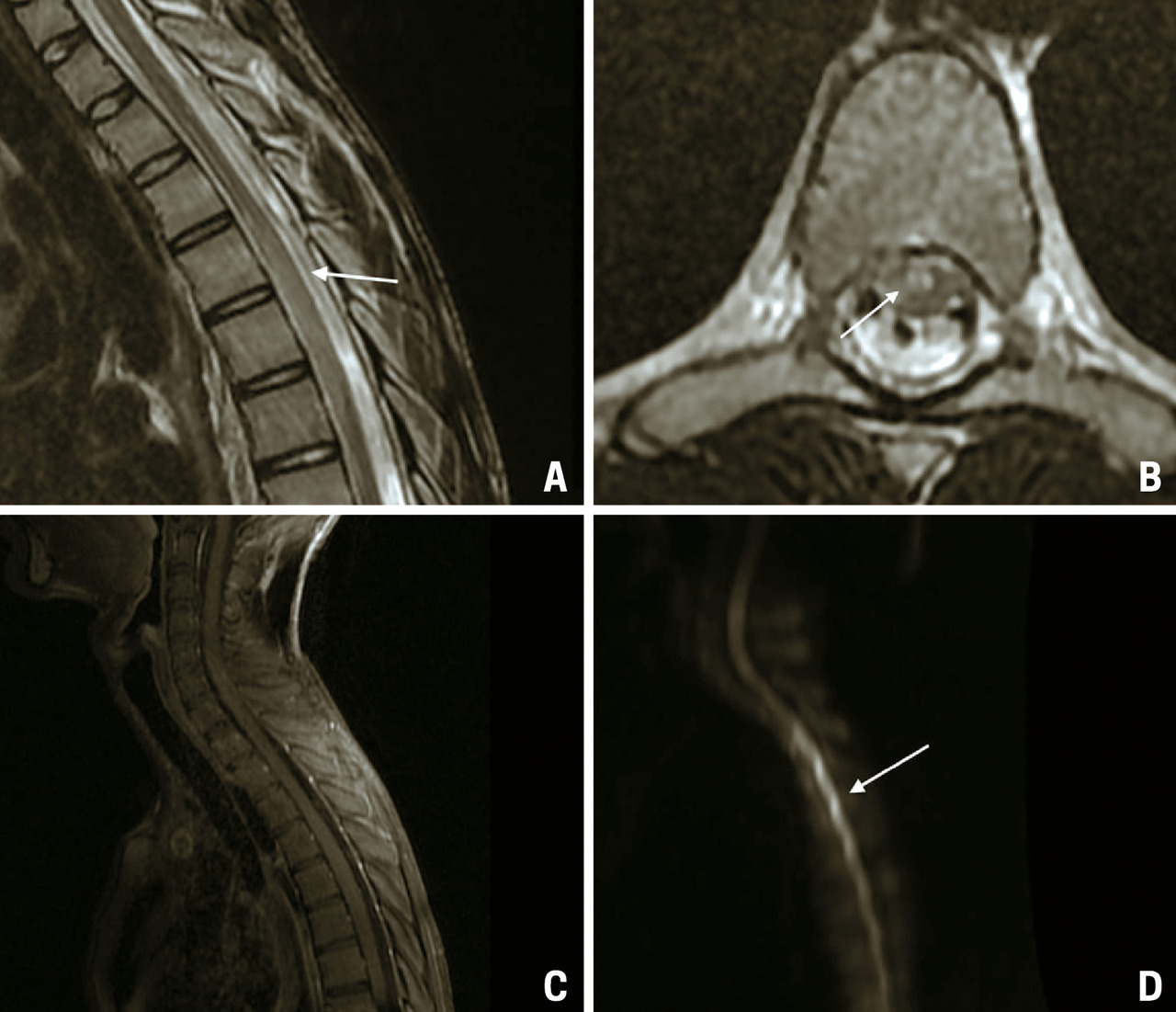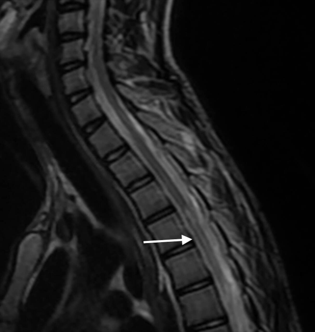 Une IRM médullaire est réalisée en urgence, mettant en évidence une anomalie de signal centromédullaire étendue de T4 à T6 en hypersignal T2 – réalisant un aspect en « œil de hibou » –, avec une restriction en diffusion et sans prise de contraste après injection de gadolinium (fig. 1).