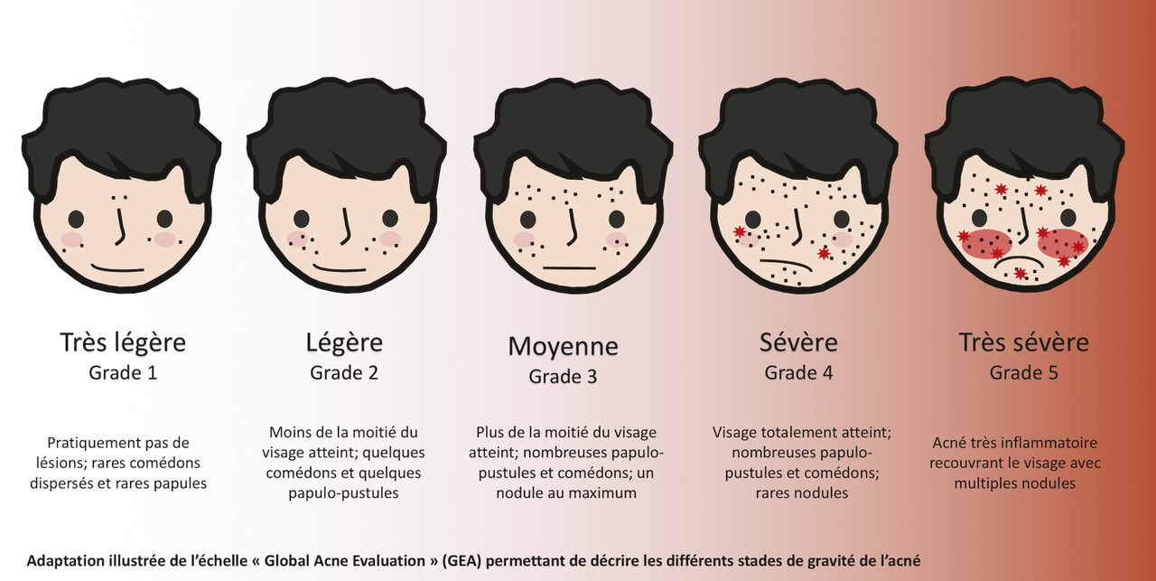 L’échelle « global acne evaluation » (GEA) est utile pour décrire les différents stades de gravité de l’acné et aider au choix thérapeutique :1