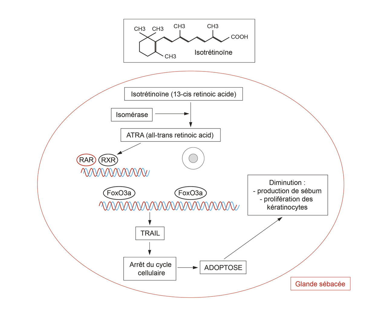 L’isotrétinoïne agit sur tous les mécanismes physiopathologiques impliqués dans l’acné, avec comme principal effet une sébosuppression (