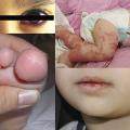 Une conjonctivite bilatérale, non purulente, apparaît chez 85 % des patients (fig. 1A ). Elle s’accompagne parfois d’une photophobie chez les plus de 2 ans (autour de J5-J8 d’évolution), due à une uvéite antérieure. Celle-ci ne provoque généralement pas de séquelle (aucun traitement particulier).