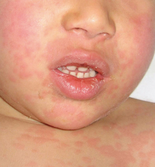 – des signes cutanés et muqueux : injection conjonctivale, éruption maculo-papuleuse, prurit, œdème et rougeur des extrémités, lèvres sèches et fissurées (chéilite), glossite ;