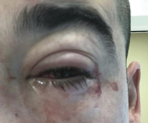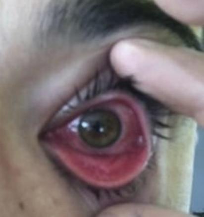 L’apparition d’une photophobie et d’un écoulement sérosanglant (