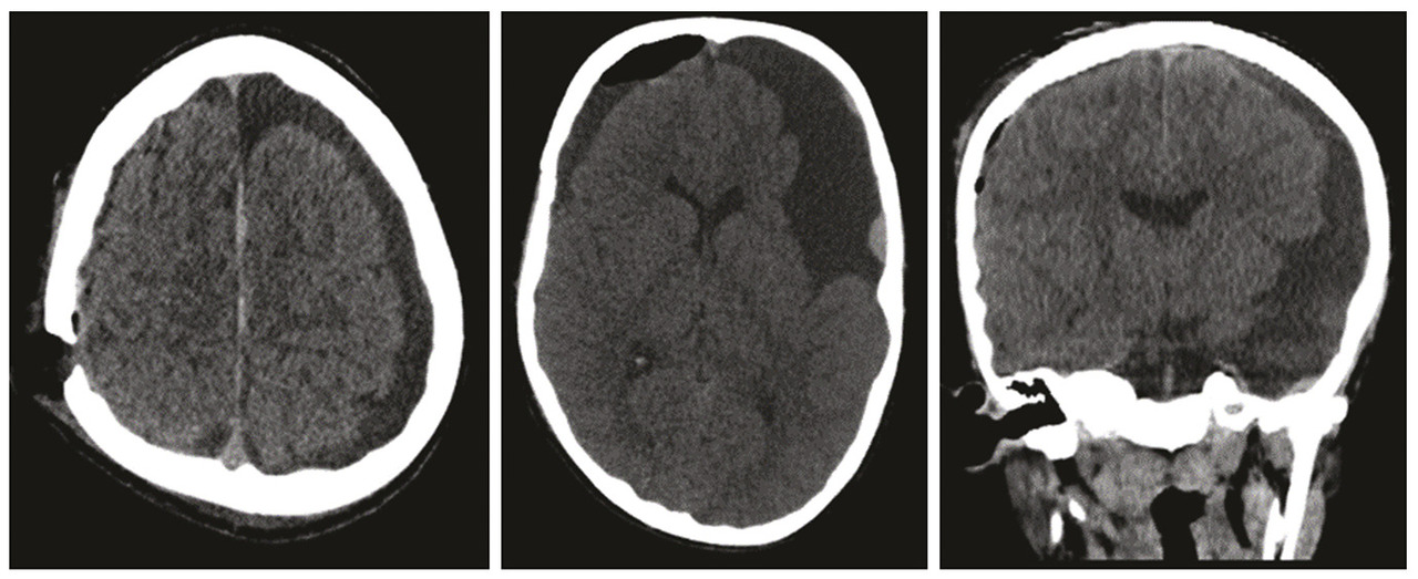 Un enfant de 12 ans est victime d’un traumatisme crânien minime occasionnant une diplopie. Le scanner cérébral montre deux hématomes sous-duraux hémisphériques chroniques ayant ressaigné et une volumineuse lésion kystique temporale gauche. Le patient a été opéré, avec évacuation de l’hématome sous-dural droit (