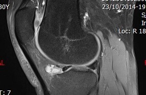 Compte tenu de la symptomatologie pauvre mais de la gêne fonctionnelle, une IRM du genou droit est effectuée, retrouvant un kyste mucoïde de la face antérieure du ménisque externe de 20 mm de grand axe (figure). La patiente a bénéficié d’une synovectomie antérieure sous arthroscopie, permettant d’amender ses douleurs.