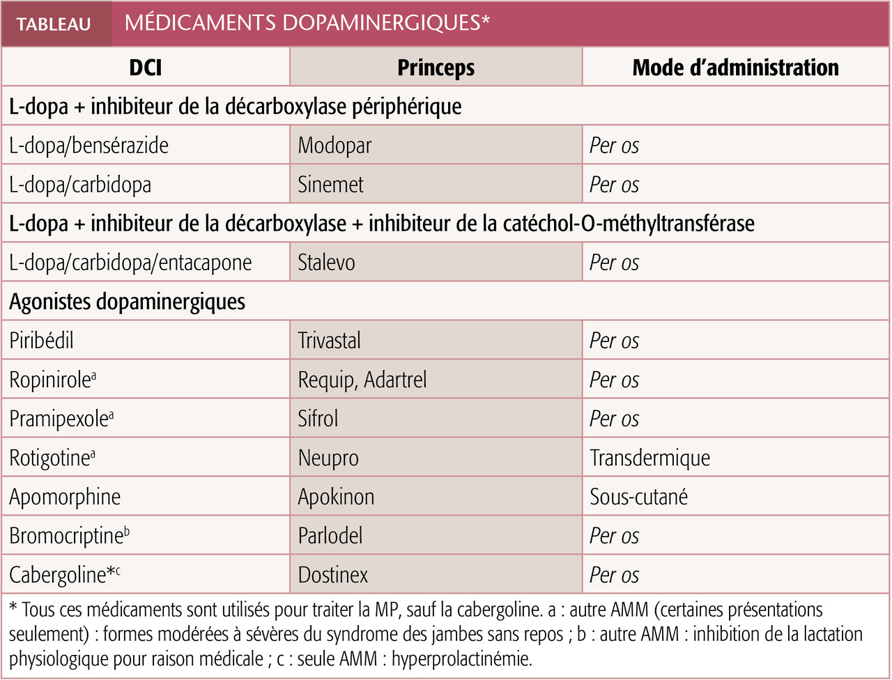 La L-dopa est le traitement de référence de la maladie de Parkinson (MP). Elle est plus efficace que les agonistes dopaminergiques (AD) et mieux tolérée, cf. infra. Mais ces derniers donnent moins de complications motrices à long terme. Trois d’entre eux (ropinirole, pramipexole, rotigotine) sont disponibles sous une forme à libération prolongée. Les dérivés de l’ergot de seigle, dont le chef de file est la bromocriptine, sont quasiment abandonnés. L’apomorphine, AD puissant mais à part, ne s’utilise que par voie sous-cutanée. Certains agonistes ont une AMM dans des affections autres que la MP (tableau).