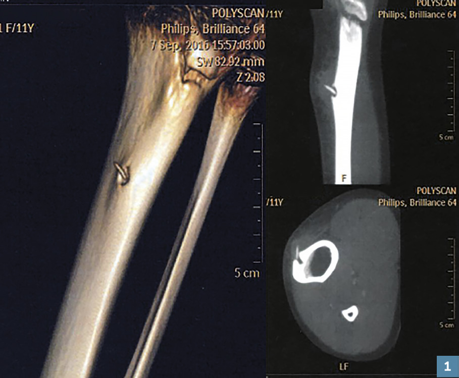 Le scanner injecté avec reconstruction 3D confirme l’ostéite corticale tibiale par pénétration d’un radiole (épine) d’oursin qui s’est planté dans l’os (