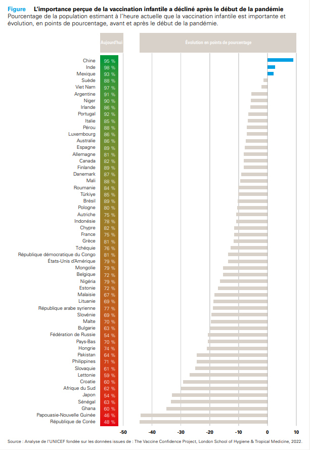 Dans 52 pays des 55 interrogés dans ces enquêtes, la confiance dans la vaccination infantile – c’est-à-dire le pourcentage de la population estimant que cette vaccination est importante – a décliné après le début de la pandémie (v. figure).