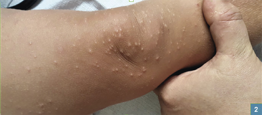L’examen montre des lésions érythémateuses, papulo-vésiculeuses, œdématiées par endroits et des excoriations de grattage. La peau périlésionnelle est saine (fig. 2 ). Les muqueuses sont respectées. Pas de fièvre, d’adénopathie ni d’altération de l’état général.