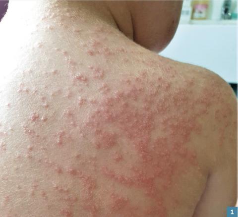 Kelyan, 19 mois, a depuis 4 jours une éruption cutanée prurigineuse d’extension rapidement progressive. D’abord localisée au niveau des bras, elle touche maintenant le visage, les 4 membres et la moitié supérieure du dos (fig. 1 ). L’abdomen, les mamelons et les plis sont épargnés.
