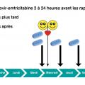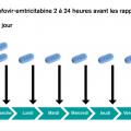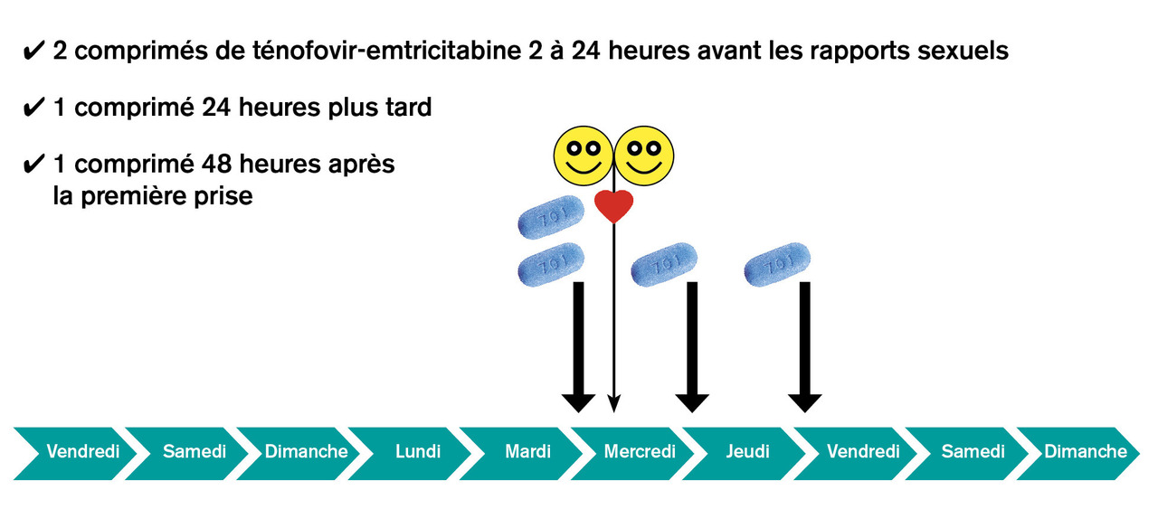 Le schéma dit « à la demande », ou « intermittent » (fig. 2), consiste en l’administration de 2 comprimés en une prise de ténofovir-emtricitabine le premier jour, 2 à 24 heures avant tout rapport sexuel à risque, puis de 1 comprimé à 24 heures et 1 comprimé à 48 heures.4 Ce schéma n’est pas recommandé chez les femmes (la pénétration des composants actifs dans le tractus génital féminin est plus lente, nécessitant une exposition au TDF-FTC plus longue afin d’obtenir une concentration efficace) et est contre-indiqué chez les personnes porteuses d’une hépatite B chronique (le TDF étant un médicament actif contre l’hépatite B, l’arrêt du TDF-FTC expose au risque de rebond viral).