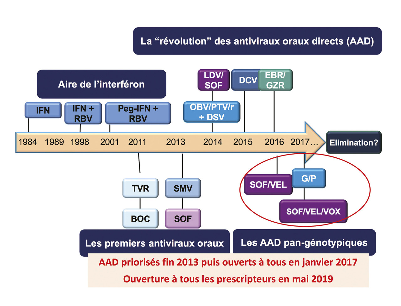 En résumé, trois combinaisons orales ayant une activité pangénotypique sont disponibles depuis avril 2017 et permettent la guérison virologique de tous les patients dépistés et donc traités pour 8 semaines (3 gélules/j de glécaprévir-pibrentasvir) ou 12 semaines (1 gélule/j de sofosbuvir-velpatasvir avec ou sans voxilaprévir) avec une tolérance satisfaisante.