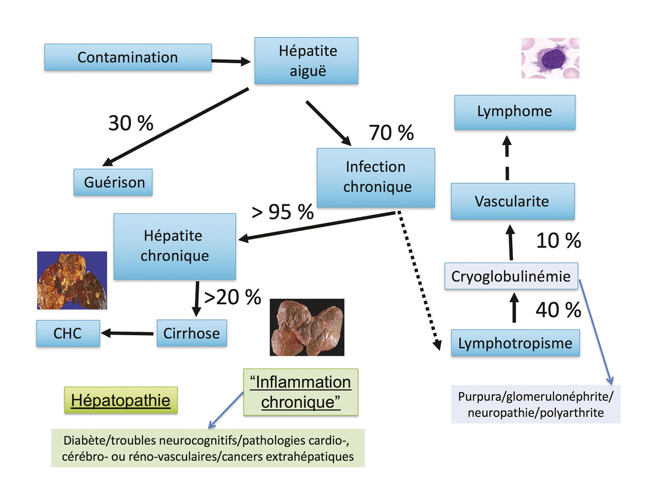 Le virus de l’hépatite C est à l’origine d’hépatites aiguës spontanément résolutives dans un tiers des cas. Le taux de passage à la chronicité de l’infection virale C est élevé, de l’ordre de 70 %.9, 10 Le VHC est, au moins dans les pays industrialisés, l’une des causes principales de transplantation hépatique et de carcinome hépatocellulaire dont l’augmentation est prévue jusqu’à environ 2030.9, 10 L’infection par le VHC est la seule infection virale chronique dont on puisse espérer guérir, et la capacité unique de régénération hépatique permet que la fibrose, conséquence de l’activité nécrotico-inflammatoire, soit en permanence remodelée, ce qui permet d’observer sa régression, en l’absence de comorbidité hépatique. Cette réparation partielle (ou complète) s’observe aussi pour les manifestations extrahépatiques.