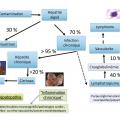 Une cryoglobulinémie, le plus souvent mixte de type II (contingent polyclonal immunoglobuline [Ig] G et monoclonal IgM kappa à type de facteur rhumatoïde), liée au lymphotropisme du VHC, est détectée chez 40 % des patients infectés ; au moins 10 % des patients cryoglobulinémiques ont des manifestations cutanées (purpura vasculaire), rhumatologiques (polyarthrite), néphrologiques (glomérulonéphrite membranoproliférative) ou neurologiques (polyneuropathie périphérique) par dépôts cryoglobulinémiques dans les artères de petit et moyen calibre.6 Il existe aussi un risque de lymphome (notamment de lymphome splénique villeux)9, 10 lié à l’infection chronique du lymphocyte B par sélection clonale des lymphocytes infectés et/ou à l’activation lymphocytaire en rapport avec l’inflammation chronique. D’autres manifestations extrahépatiques témoignent de l’inflammation chronique associée à l’infection virale C (activation lymphocytaire, comme celle de l’infection par le VIH) et sont observées avec un risque relatif de 1,5 à 3 de diabète non insulindépendant, d’atteintes cardio-, cérébro- ou rénovasculaires et également de cancers extrahépatiques (